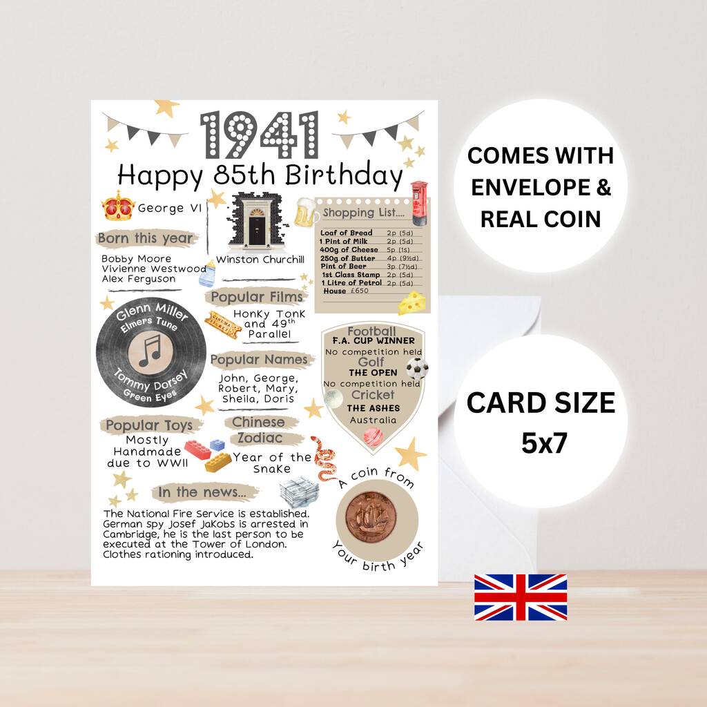 A perfect card to reminisce of 1941 in Britain and look at popular songs, names and films in the year the recipient was born. This nostalgic keepsake card comes with a genuine, circulated 1941 dated coin which is polished and attached to the card. The type of coin may change from the one in the listing photo depending on stock. Cards are placed in a cello bag and are sent in a hard-backed 'Do Not Bend' envelope for protection