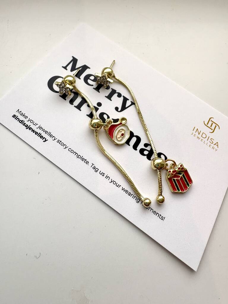Featuring a playful Santa and a festive wreath that slide gracefully along a delicate gold chain, these earrings bring movement and charm to every wear. Each piece is crowned with a dazzling, sparkling star, perfect for catching the light and spreading Christmas cheer