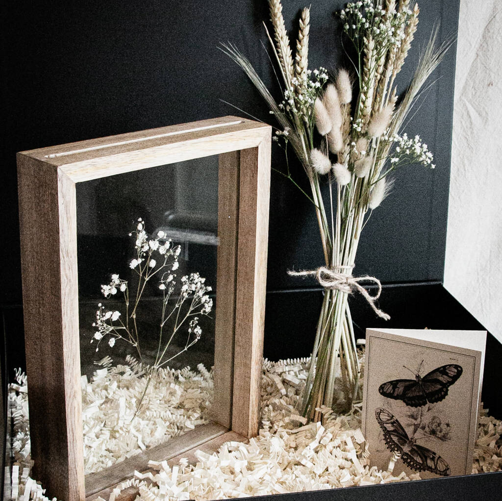 At the heart of this exquisite set lies a large mango wood pressed flower frame, featuring delicate, genuine pressed gypsophila — a botanical symbol of everlasting love and grace. Handcrafted with care, this statement piece adds organic charm and enduring style to any wall, shelf, or mantel.
