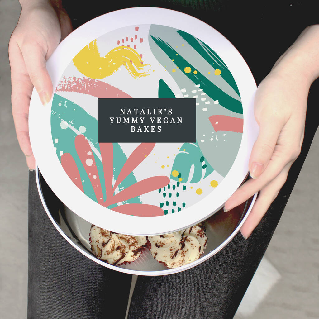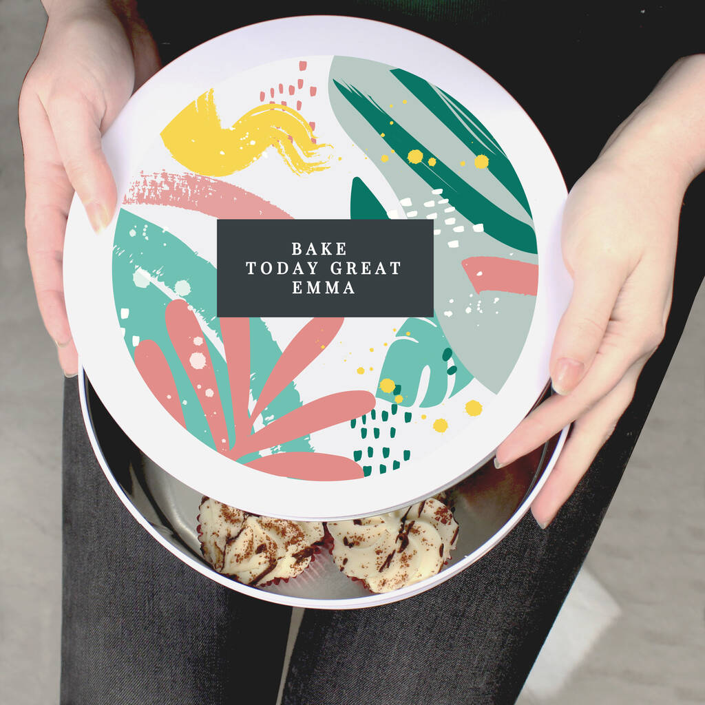 Celebrate artistic bakers with this personalised abstract design cake tin—a contemporary metal storage solution perfect for creative Christmas gifting.This striking cake tin features modern abstract artwork, bringing contemporary style to kitchen storage this festive season. Personalise with three message lines to create a bespoke baking essential ideal under the tree for artistic home bakers. The snug-fitting lid preserves freshness whilst the 23cm diameter holds impressive cakes and bakes. Hand wash only to maintain the beautiful abstract design. A thoughtful Christmas present for creative bakers, art-loving cooks, or anyone who appreciates contemporary kitchen accessories with personalised touches. Perfect for storing festive bakes, celebration cakes, and homemade creations throughout the year with modern flair.