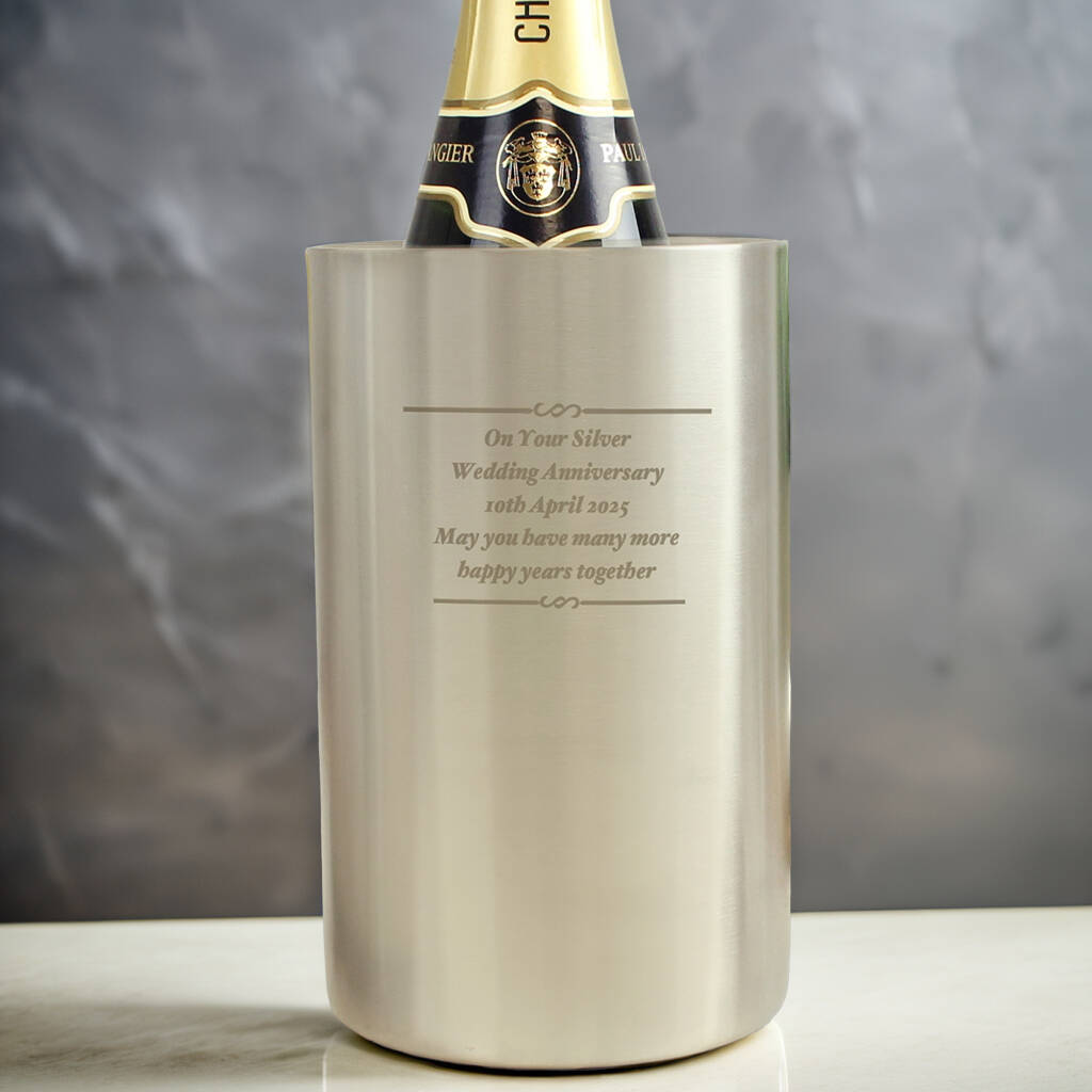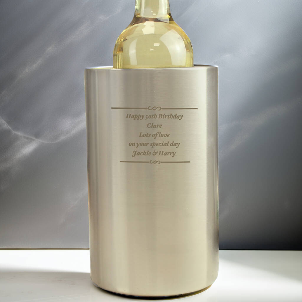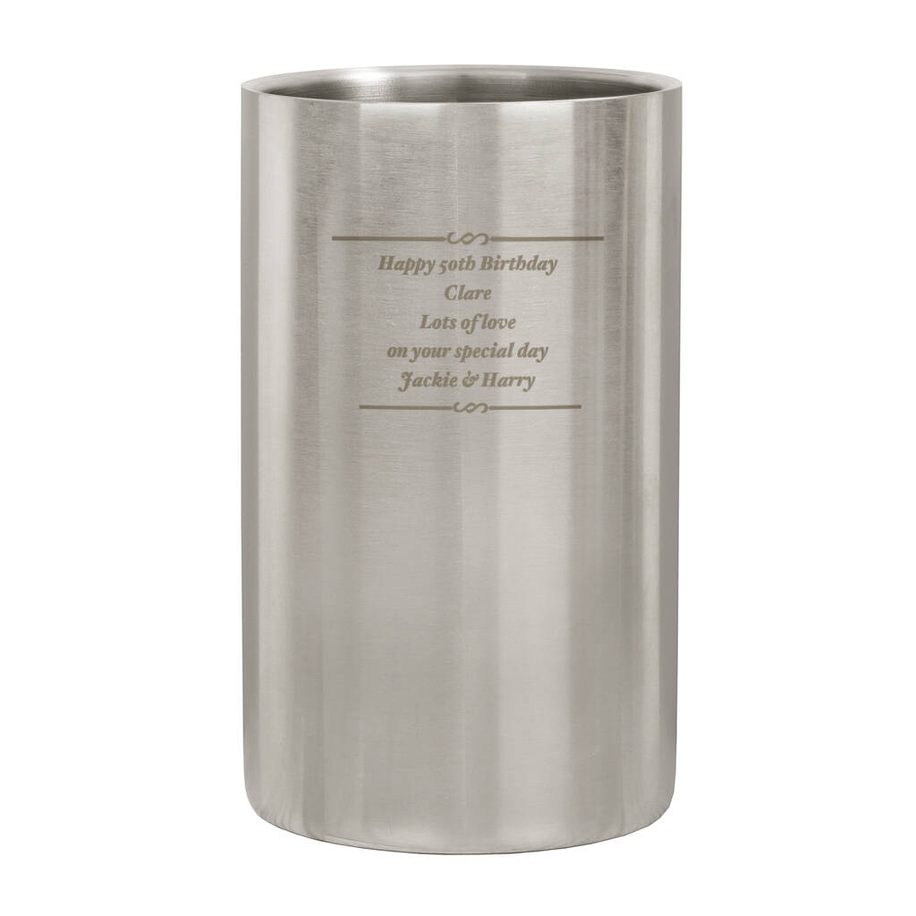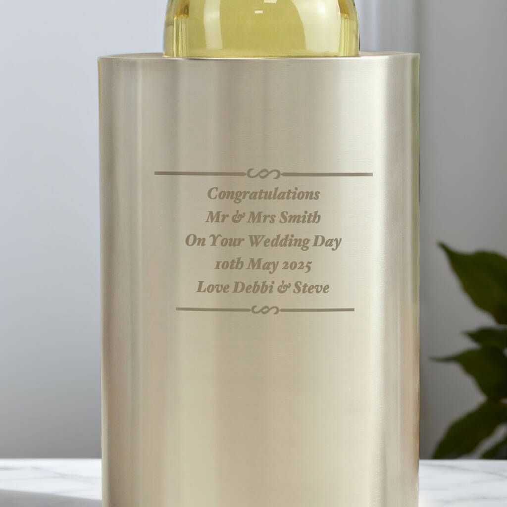 Contemporary stainless steel wine cooler personalised over five lines—perfect for birthdays, anniversaries and festive Christmas entertaining.