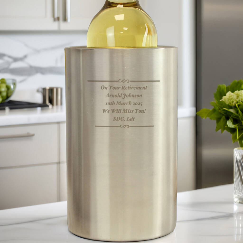 A versatile gift for any celebration, this brushed stainless steel wine cooler features double-walled insulation to maintain an ideal chill. Add up to five personalised lines to mark birthdays, weddings or retirements. A thoughtful present for seasonal entertaining and Christmas toasts, sized for standard wine and champagne bottles and designed for easy hand washing.
