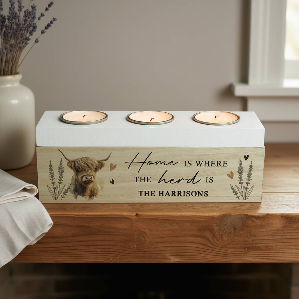 Personalised Highland Cow Triple Tea Light Box