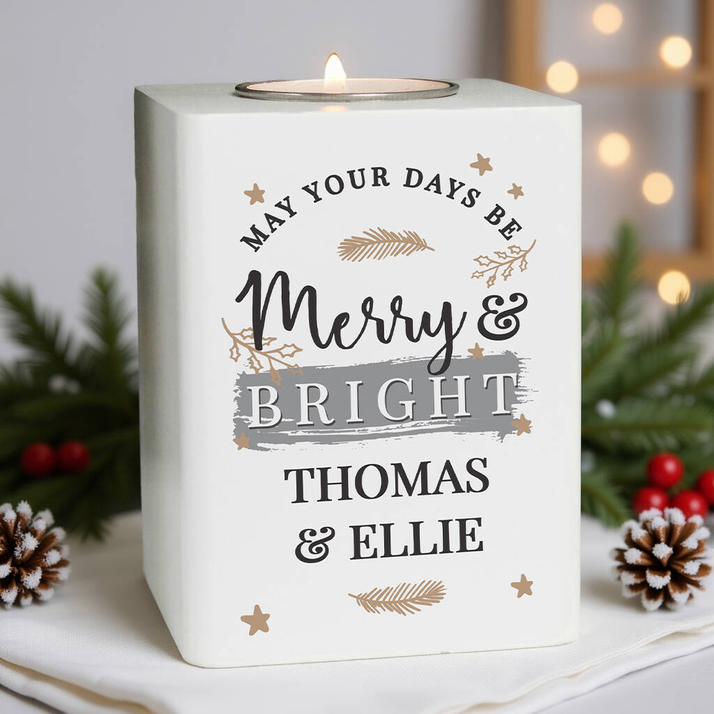 Personalised Merry And Bright White Wooden Tea Light Hold