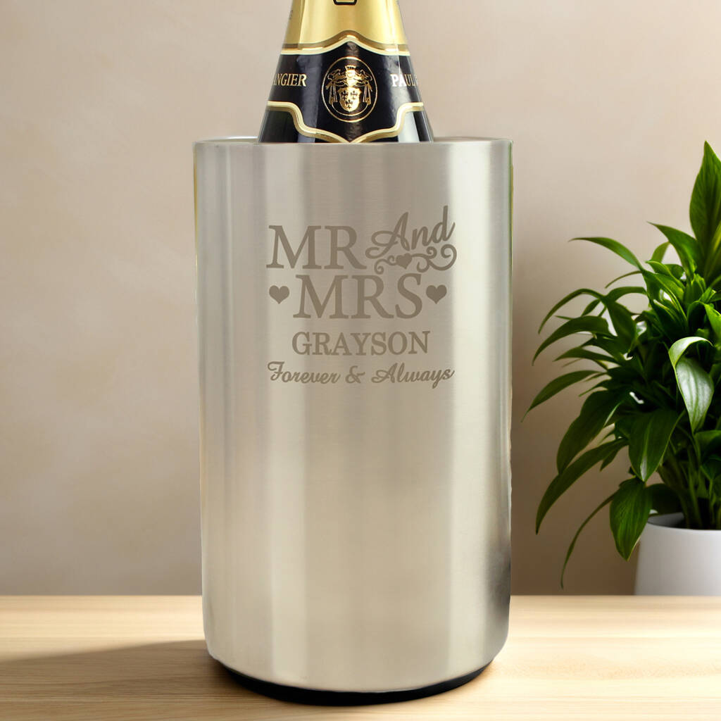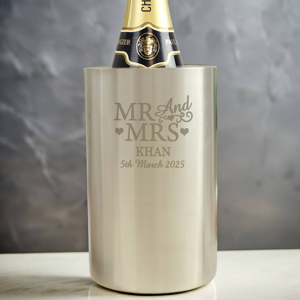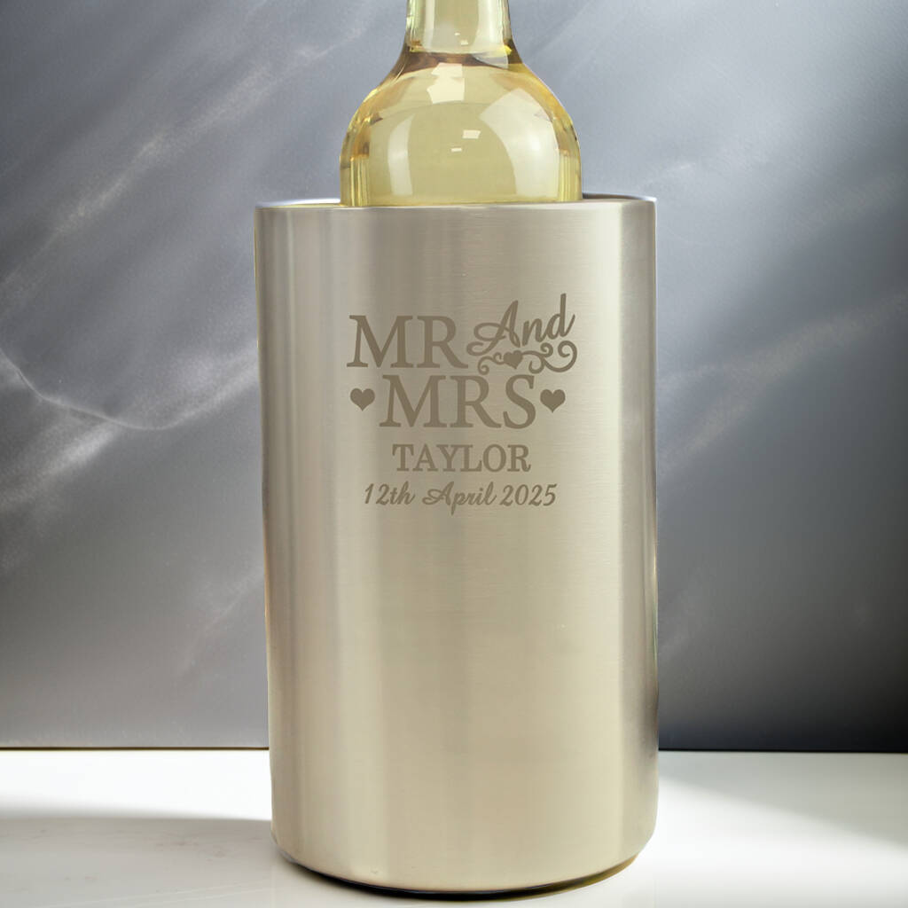 Elegant stainless steel wine cooler personalised with surname and date—perfect for weddings and anniversaries.