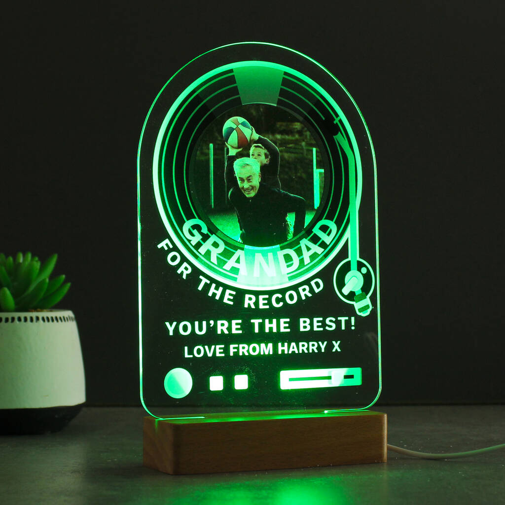 Celebrate music lovers with this personalised record photo LED light—upload images for a colour-changing retro decoration perfect under the tree.This stylish LED light features vintage record design with the fixed message 'For the record, you're the best'—perfect for music enthusiasts this Christmas. Upload your favourite photograph and add a name plus message to create a truly bespoke gift ideal for vinyl collectors, musicians, or nostalgic music lovers. Seven colour options create atmospheric lighting controlled via the easy-to-use pad. USB-powered for placement in living rooms, music rooms, or bedrooms. A thoughtful Christmas present for fathers, music fans, or anyone who treasures retro-inspired personalised décor with photographic memories and musical charm.