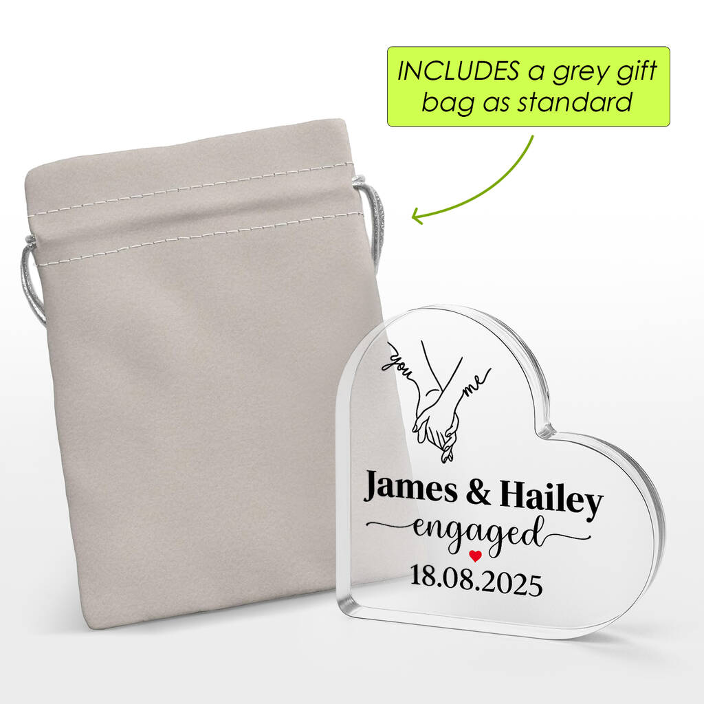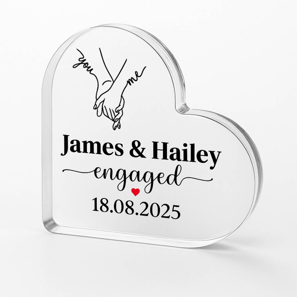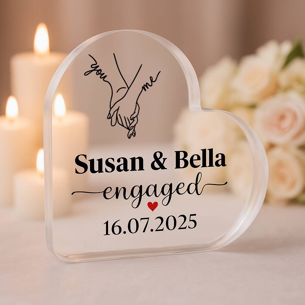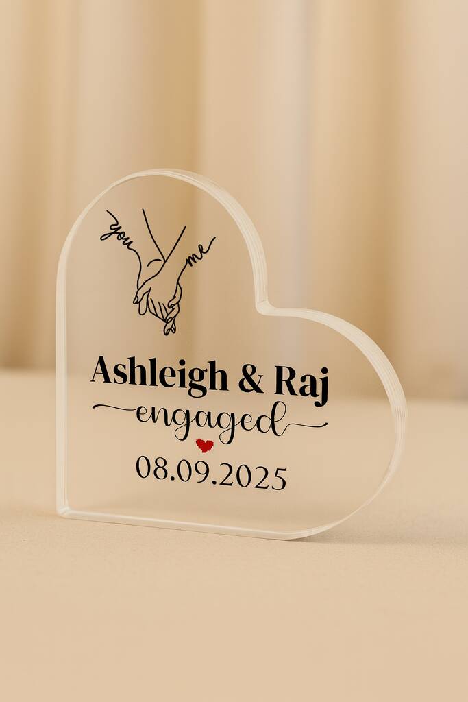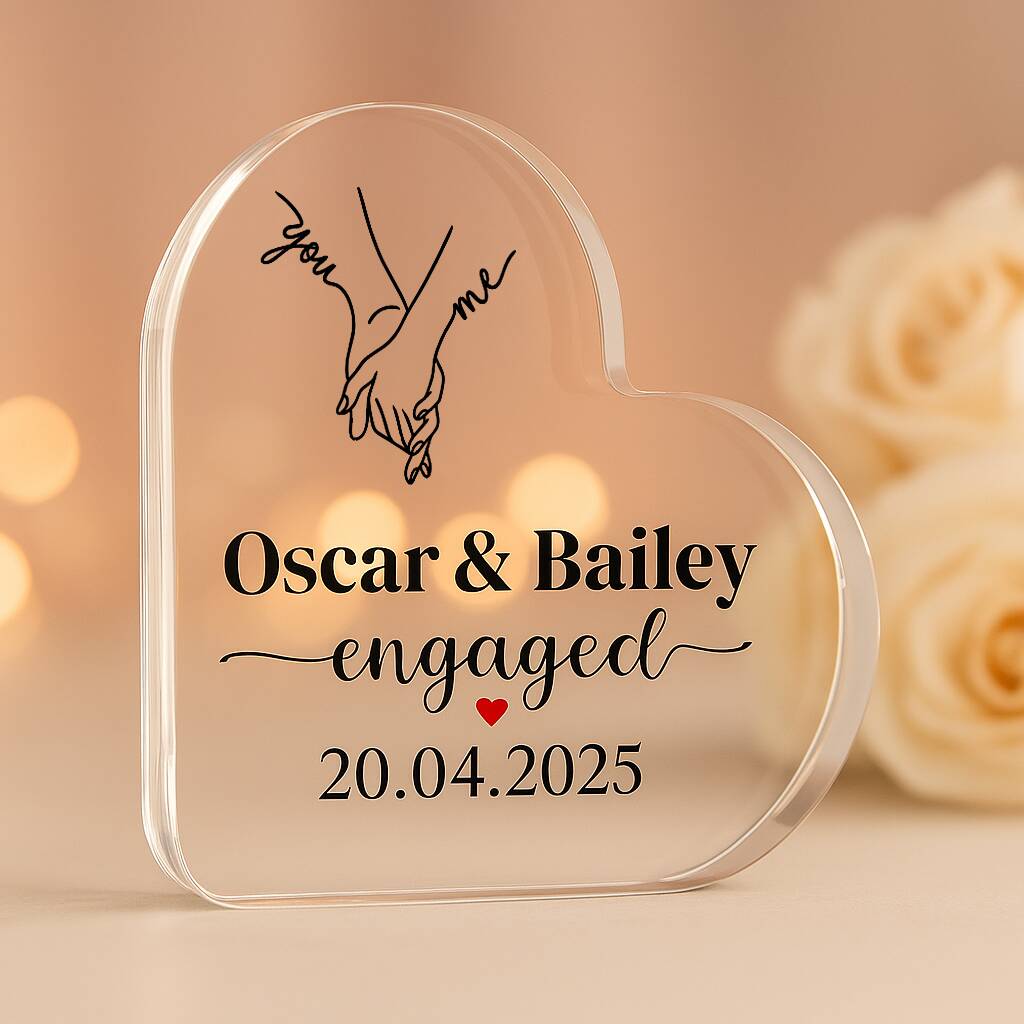 Crafted Memories presents a personalized crystal-style acrylic heart keepsake, beautifully designed with names, a special date, and delicate floral artworkCelebrate a beautiful milestone with our Personalised Engaged Acrylic Heart Plaque, a romantic keepsake designed to capture the joy of saying “yes.” Crafted in a stunning heart shape, this elegant crystal-style acrylic plaque can be customised with the couple’s names and a special date, making it a meaningful gift that will be cherished for years to come. Whether you’re surprising your fiancé, gifting a newly engaged couple, or looking for a thoughtful present from friends or family, this custom couple gift is the perfect way to mark the occasion.