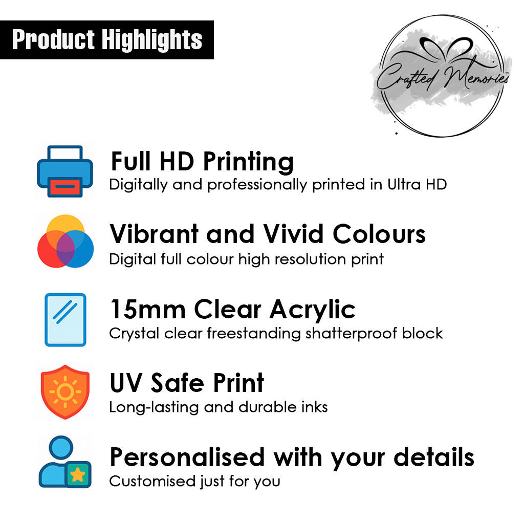 Unlike fragile glass, this personalised engagement gift is crafted from premium 12 mm clear acrylic, giving it the same sleek, crystal-like appearance with enhanced durability. Measuring approximately 85×80 mm, this anniversary gifts for her is the perfect size to display on a shelf, desk, or bedside table. The design of wedding gifts for bride and groom is printed with high-quality UV inks, ensuring that it remain crisp, vibrant, and long-lasting.