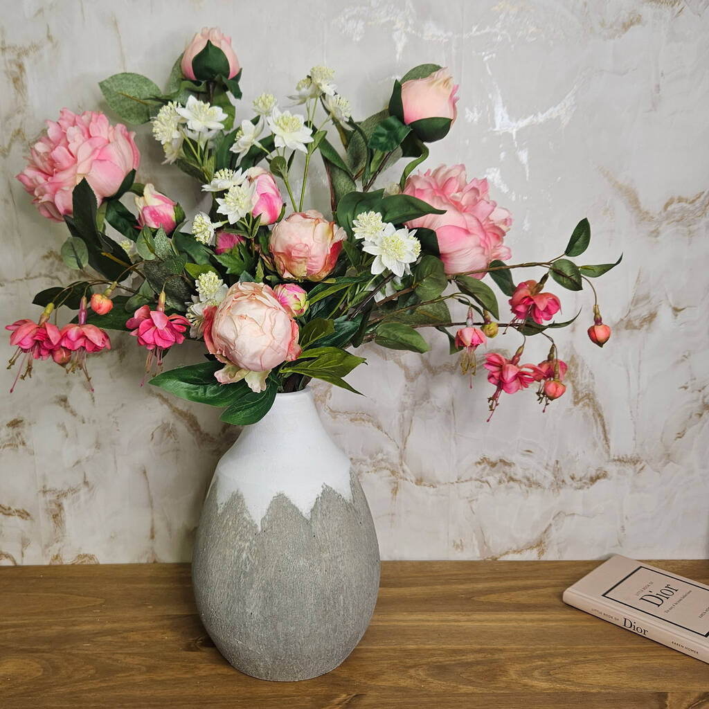 Faux fuchsias, with their ballerina tutu shaped petals, were the point of conception for our Arabesque artificial flowers bouquet.Arabesque is a study of beauty with luxury faux peonies at various stages of the 'growing' cycle and clouds of white astrantia framed by dancing fuchsias. She is poised and balanced with conventional proportions and has all the epaulement of a classically trained ballerina.