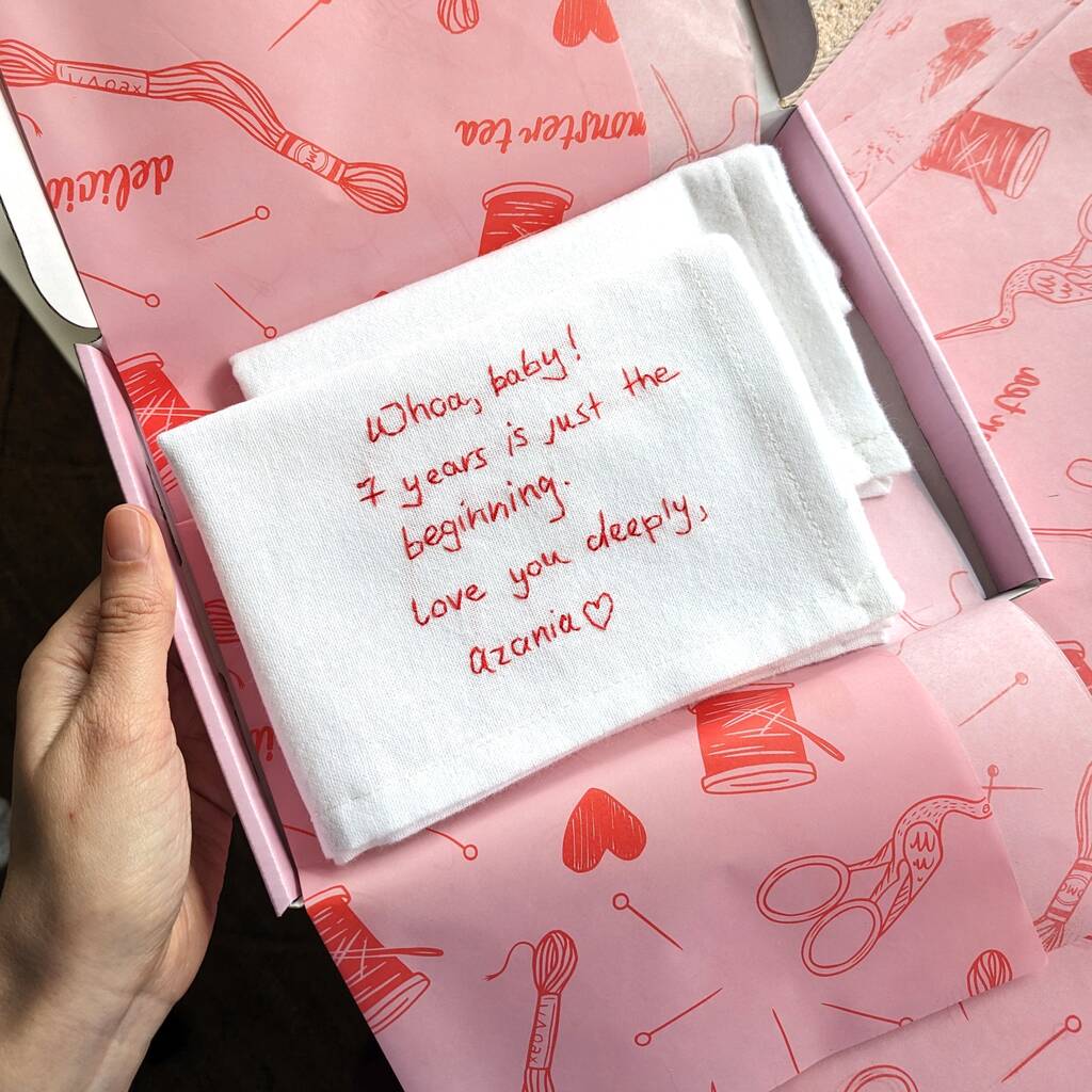 As soon as you have purchased this item, please use the 'Contact the Seller' button to send me a photo of the handwriting that you would like me to hand embroider on your handkerchief. If you do not have a copy of the exact message that you would like, I can 'assemble' a message for you from one or more handwriting samples, e.g. a shopping list and/or birthday cards.
