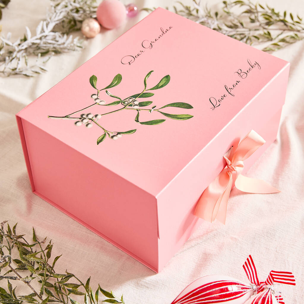 A thoughtful way to present a wide variety of gifts, this Christmas box is decorated with a festive mistletoe branch, which all ages will love.