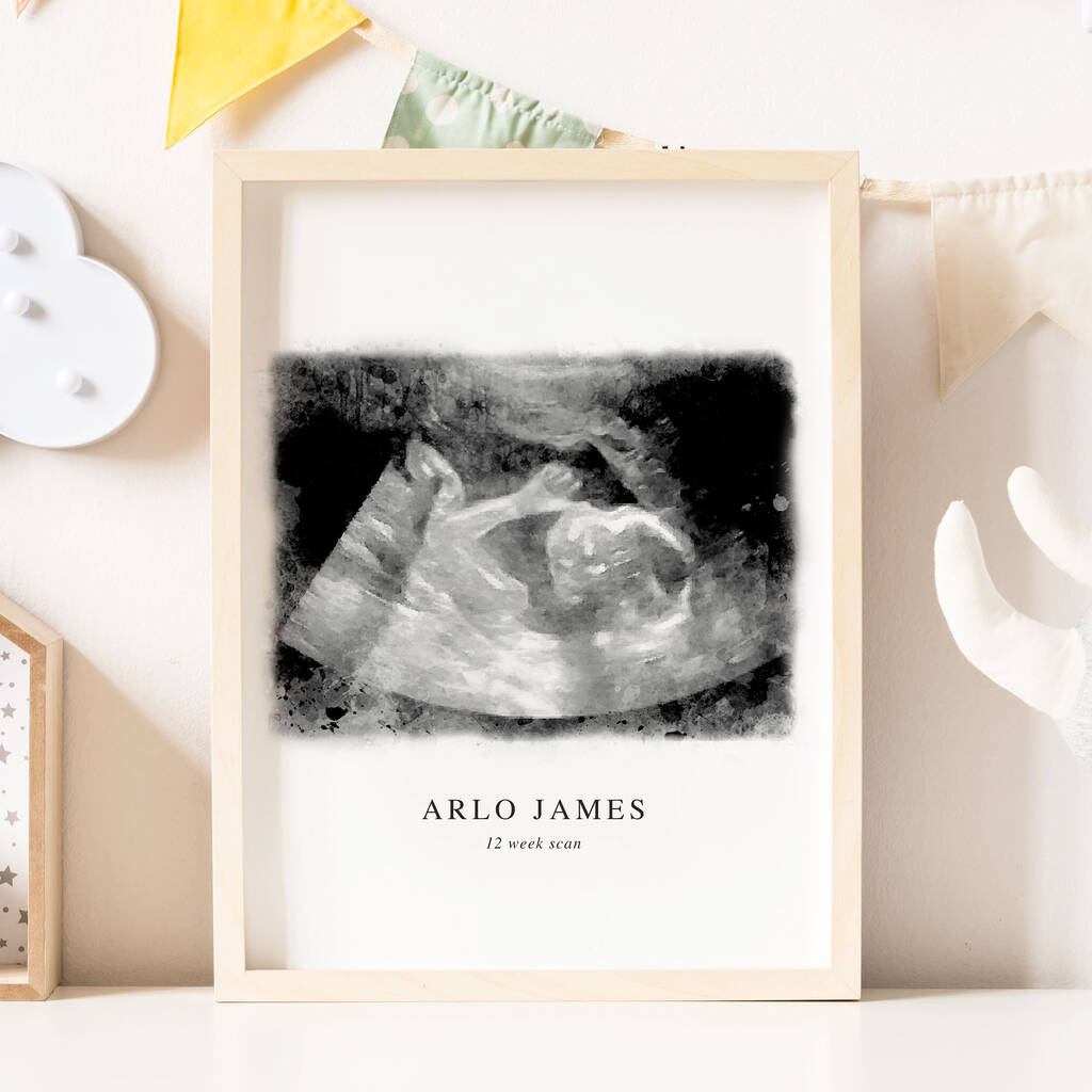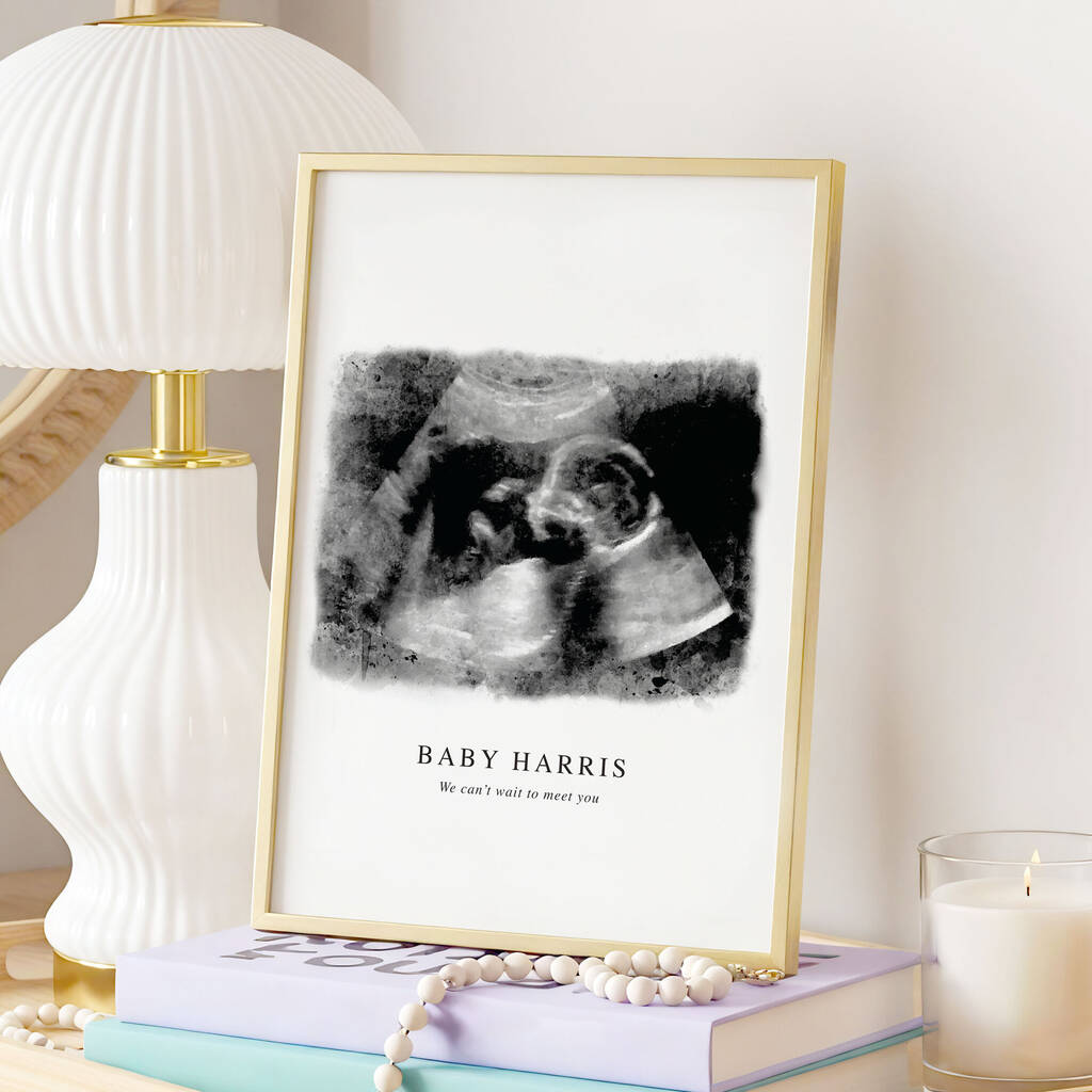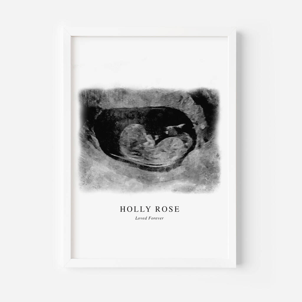 A beautifully personalised baby scan print, transforming your ultrasound image into a stunning piece of nursery art or a cherished memorial keepsake.