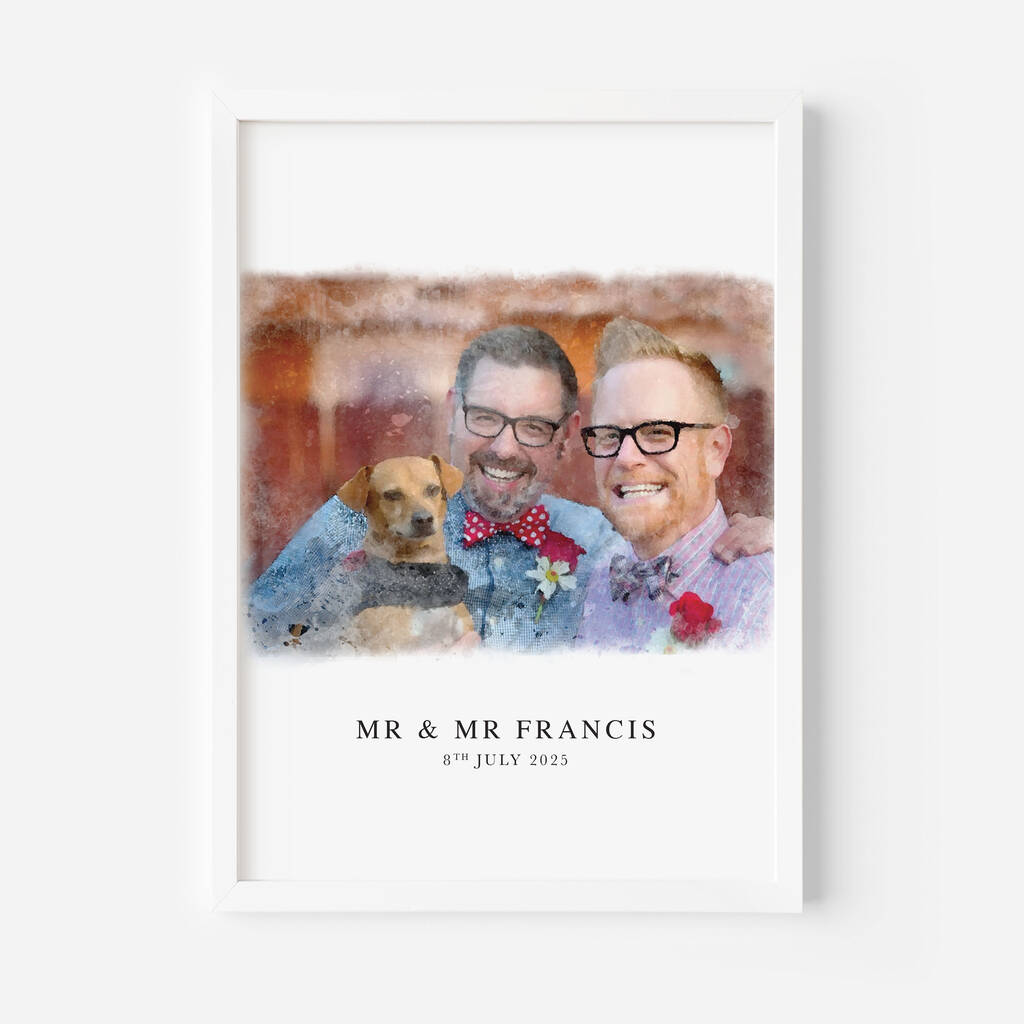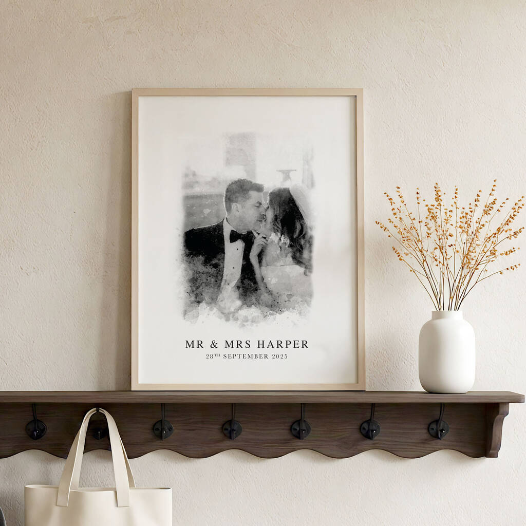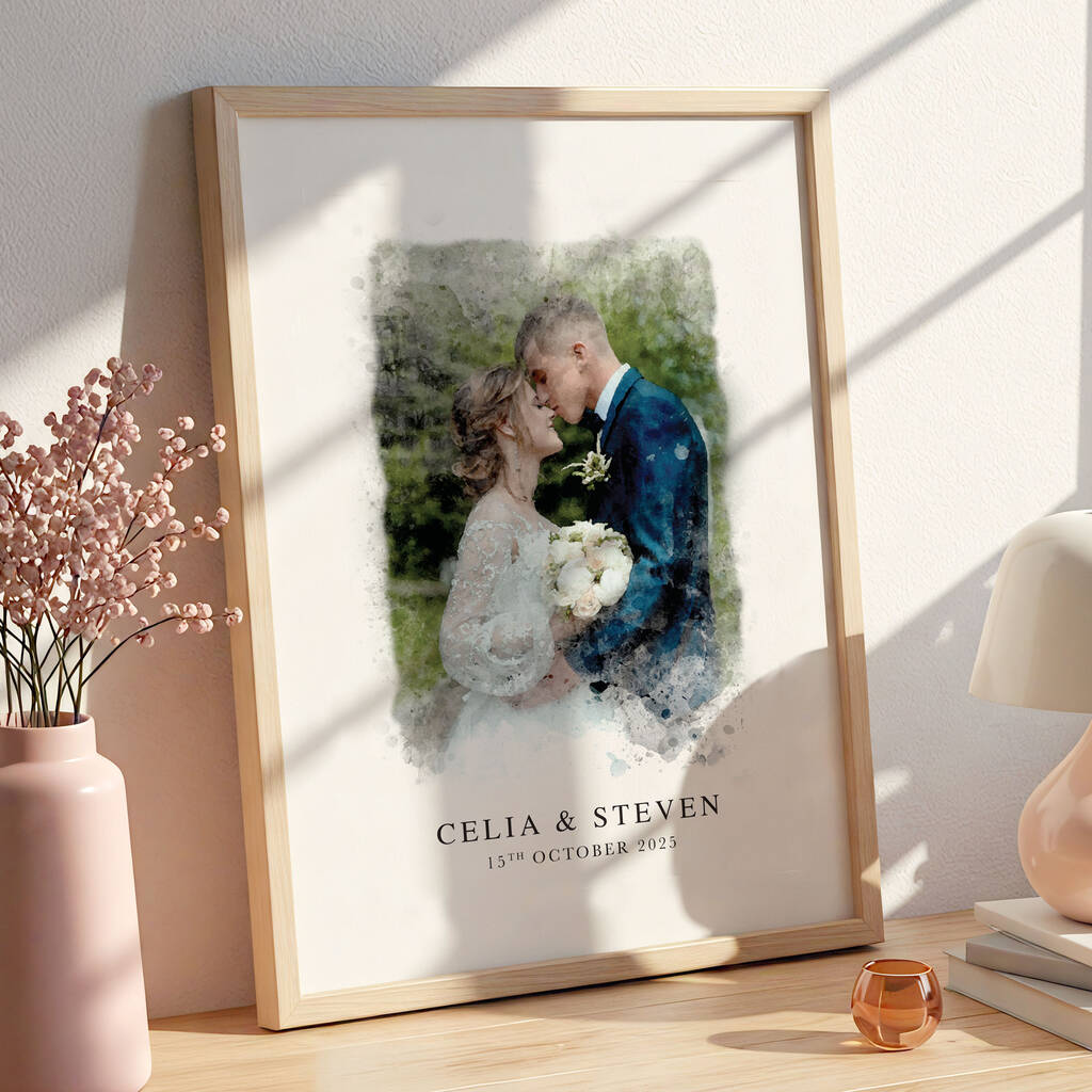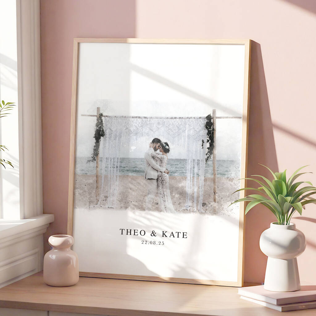 Each portrait is digitally illustrated from a photo you provide, then personalised with your names and wedding date. Whether it’s a favourite moment from your ceremony, first dance or a quiet candid, this custom artwork transforms your photograph into a timeless keepsake.