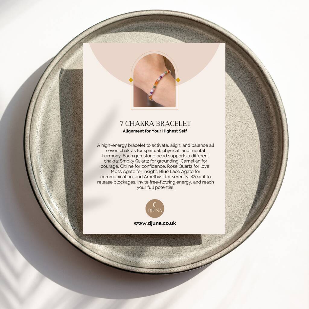 Embrace the journey of balance and self-discovery with this Chakra Bracelet, featuring seven natural gemstones each attuned to a different energy centre.