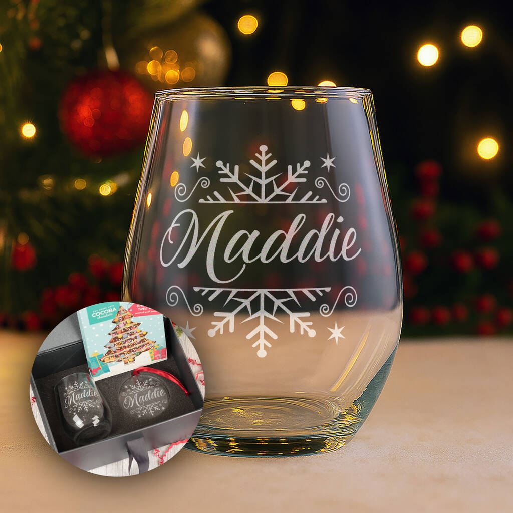 • Christmas Snowflake Stemless Glass With Chocolate Tree And Coaster Gift Boxed Set, thumbnail 1 of 7