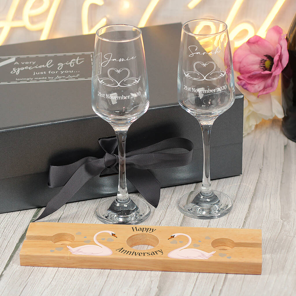 Wedding Anniversary Swans Champagne Flutes And Bottle Butler Gift Set