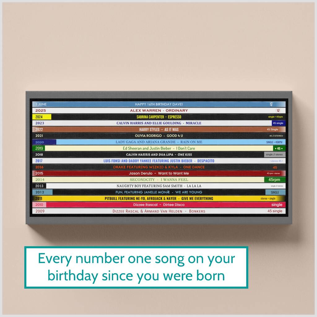 This personalised music gift pictures a record collection that shows the number one song for every birthday, from 2009 (the year of birth) to the latest available birthday number one on the date you order. If the date of birth date is 8th July, for example, the number one song for 8th July each year since 2009 is pictured - that's a lifetime of number one hits for anyone celebrating their 16th birthday! Great as a Christmas gift too!