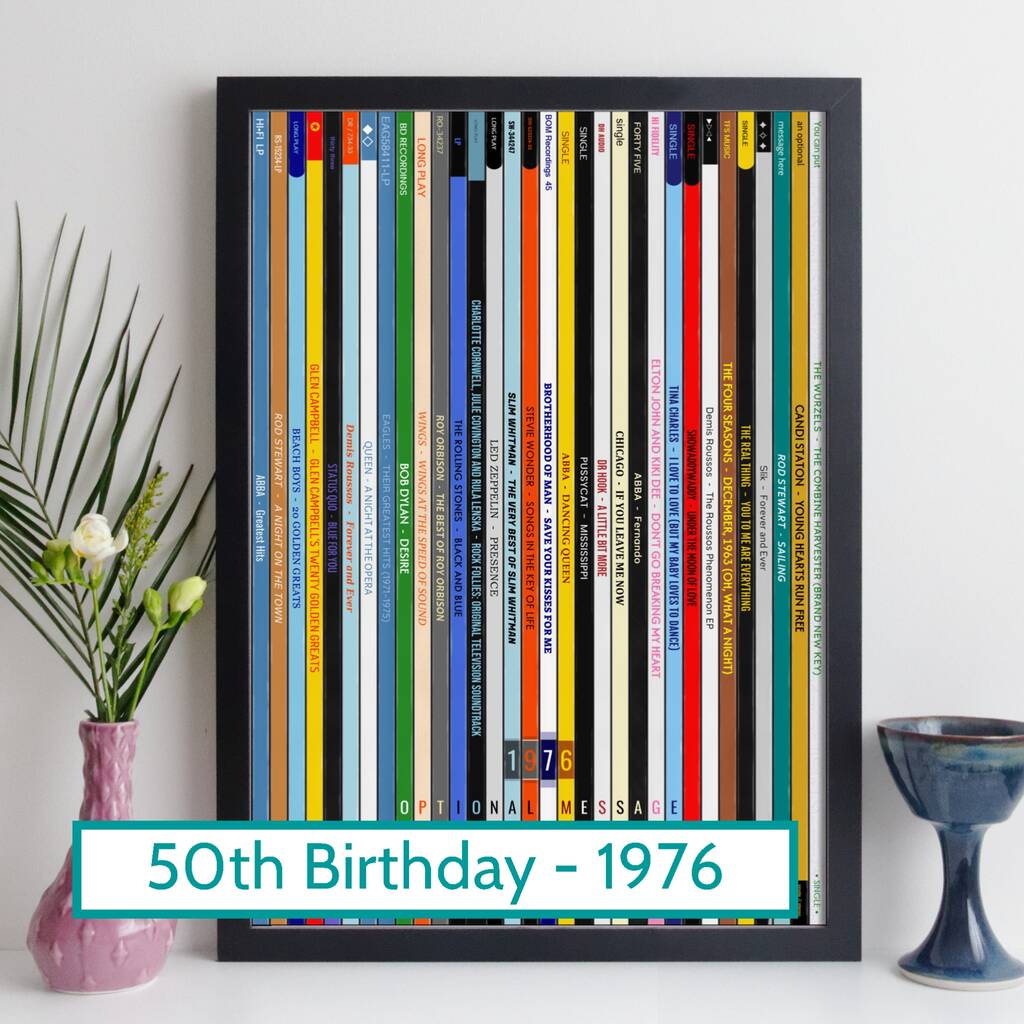 A unique personalised music print that's a brilliant 50th birthday gift, celebrating popular music from 1976. The print pictures a record collection of popular albums and singles that were high in the charts in 1976 - it's a real memory-jogger and conversation-starter.