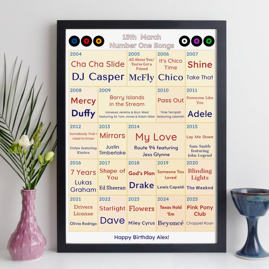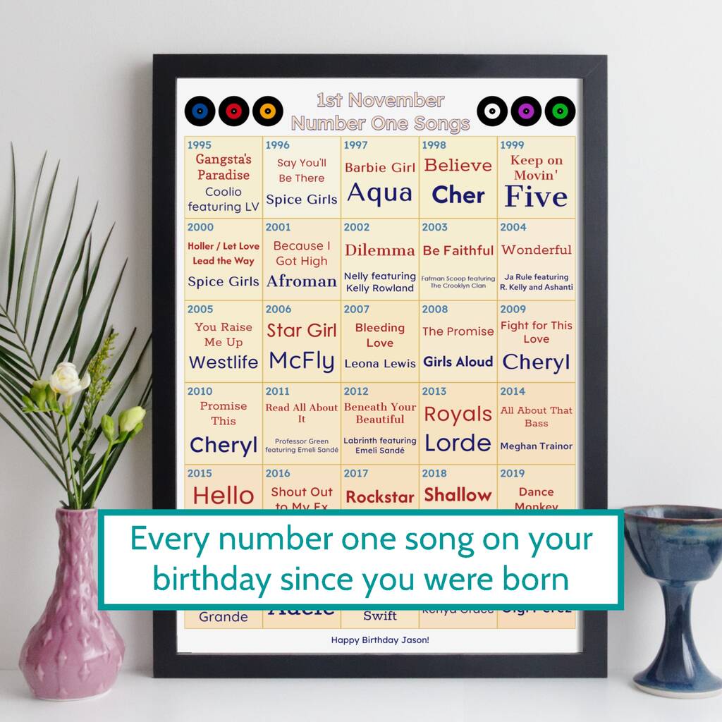 Personalised Number One Songs Print Any Year Music Gift