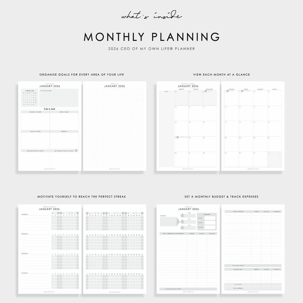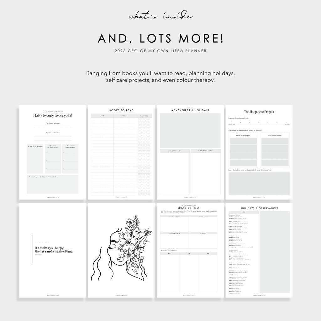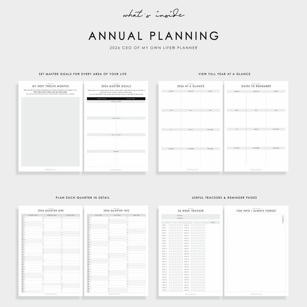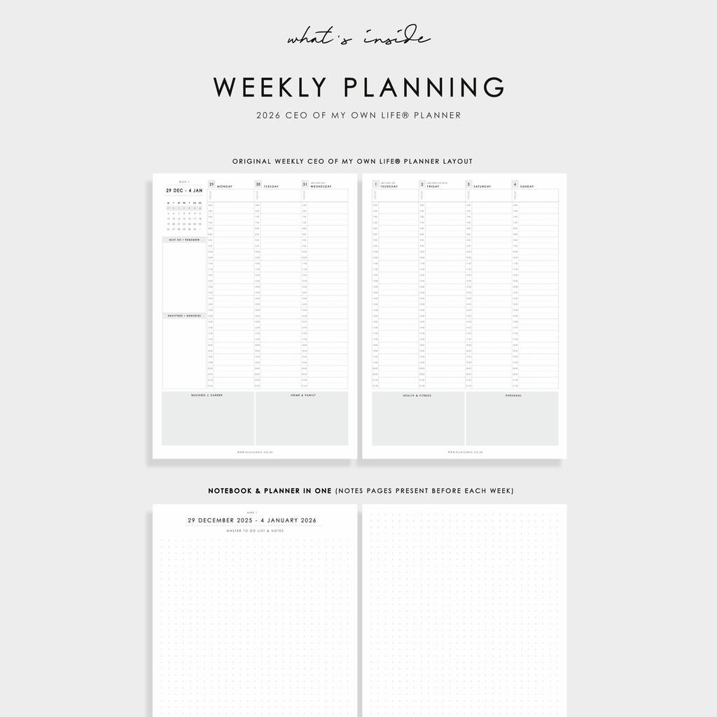This 2026 CEO of My Own Life® weekly life planner comes with a primary vertical week on two pages layout with plenty of planning sections for all your organisation needs, from budgeting, habit tracking, to colour therapy.