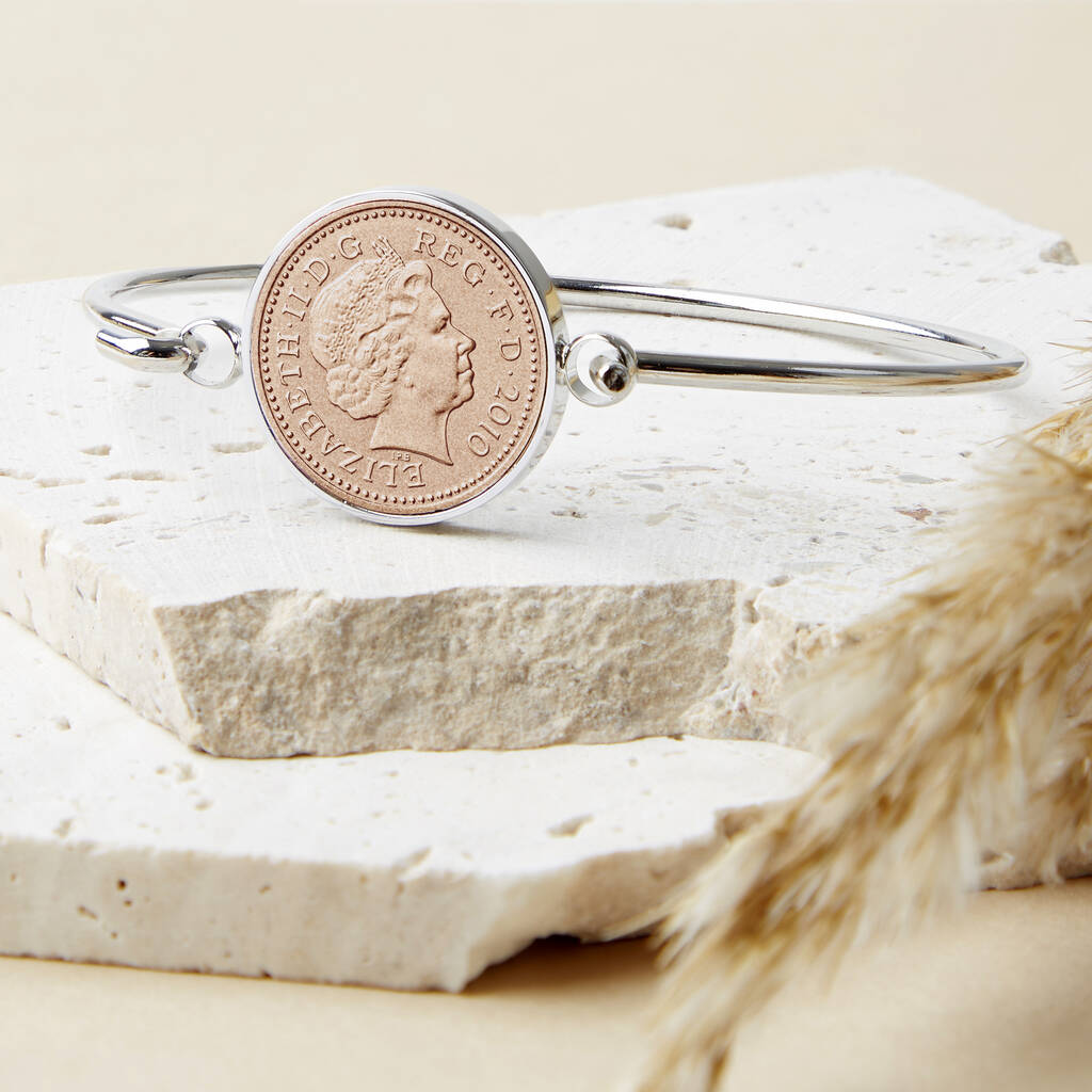 A stylish, delicate personalised bracelet made with a genuine 2010 penny coin on a silver plated bangle.