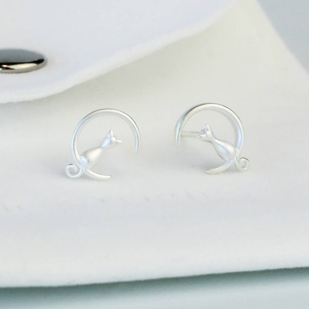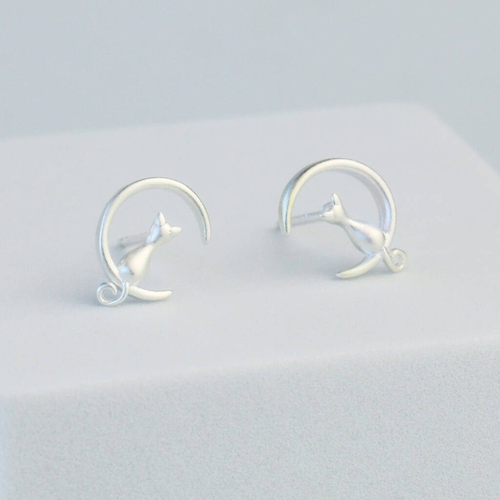 Sterling Silver Cat And Crescent Moon Stud Earrings