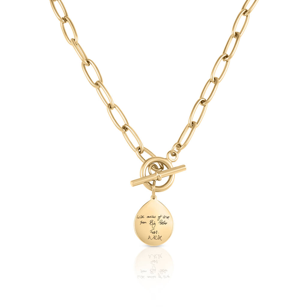 Engrave a loved ones handwriting on this stunning necklace. Upload a picture of their writing and we'll turn it into a beautifully engraved piece.