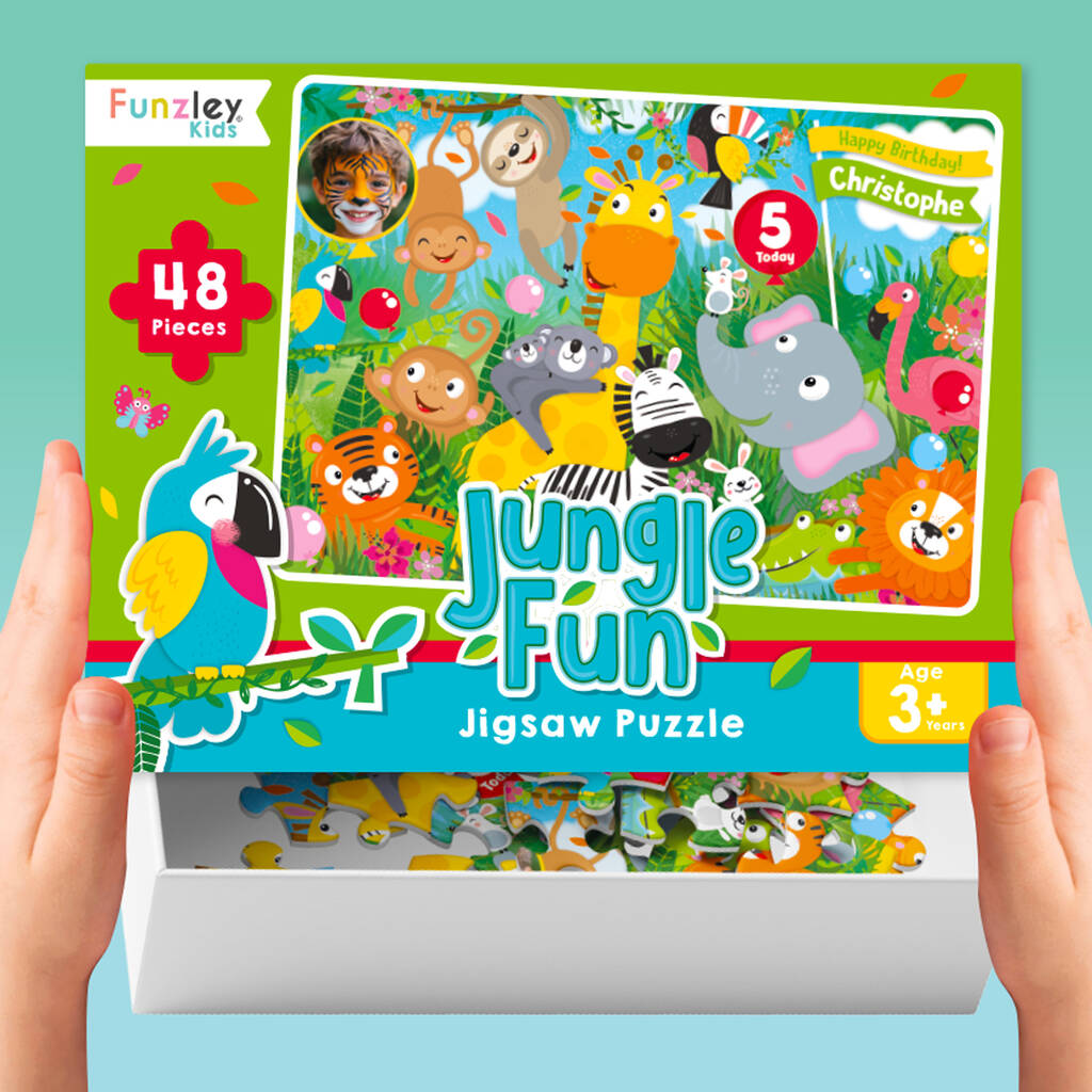 Personalised Jungle Fun Birthday Jigsaw, featuring your child’s name, age and photo, presented with a matching personalised lid.