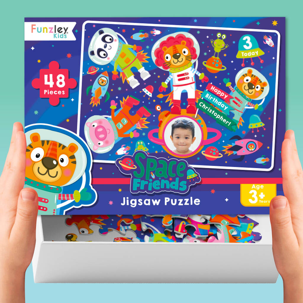 Personalised Space Friends Birthday Jigsaw, featuring your child’s name, age and photo, presented with a matching personalised lid.