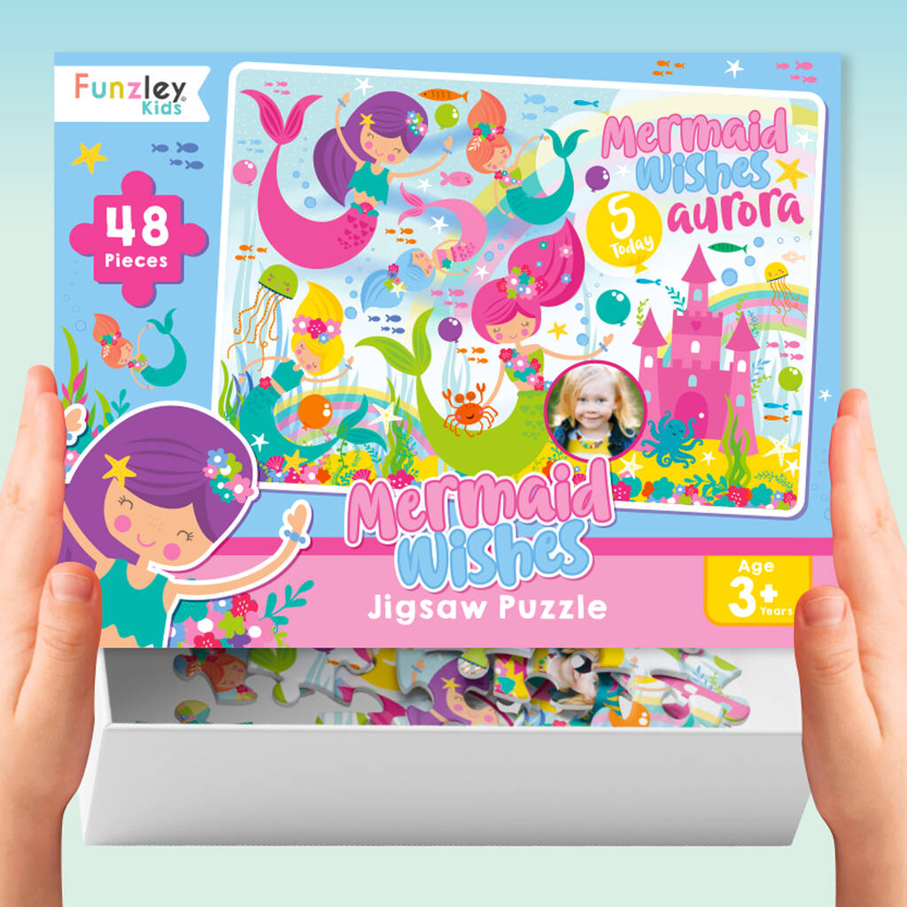 Personalised Mermaid Wishes Jigsaw, featuring your child’s name, age and photo, presented with a matching personalised lid.