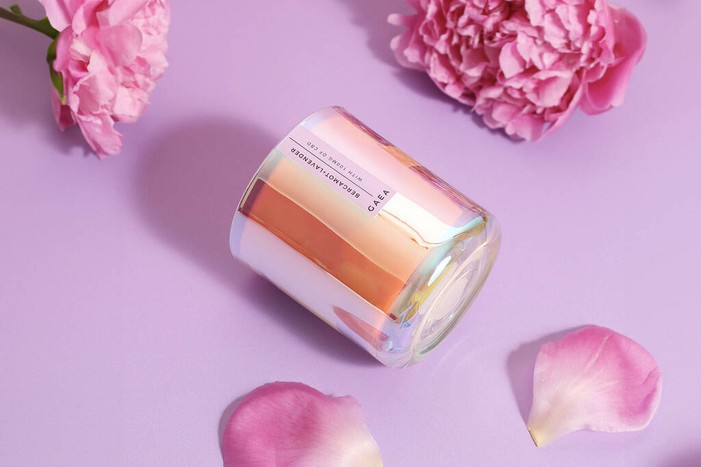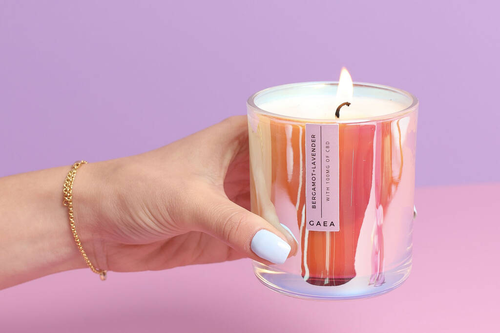 Gaea Cbd Infused Candle With 100mg Of Cbd Oil In An Irridescent Glass Jar And Gift Box