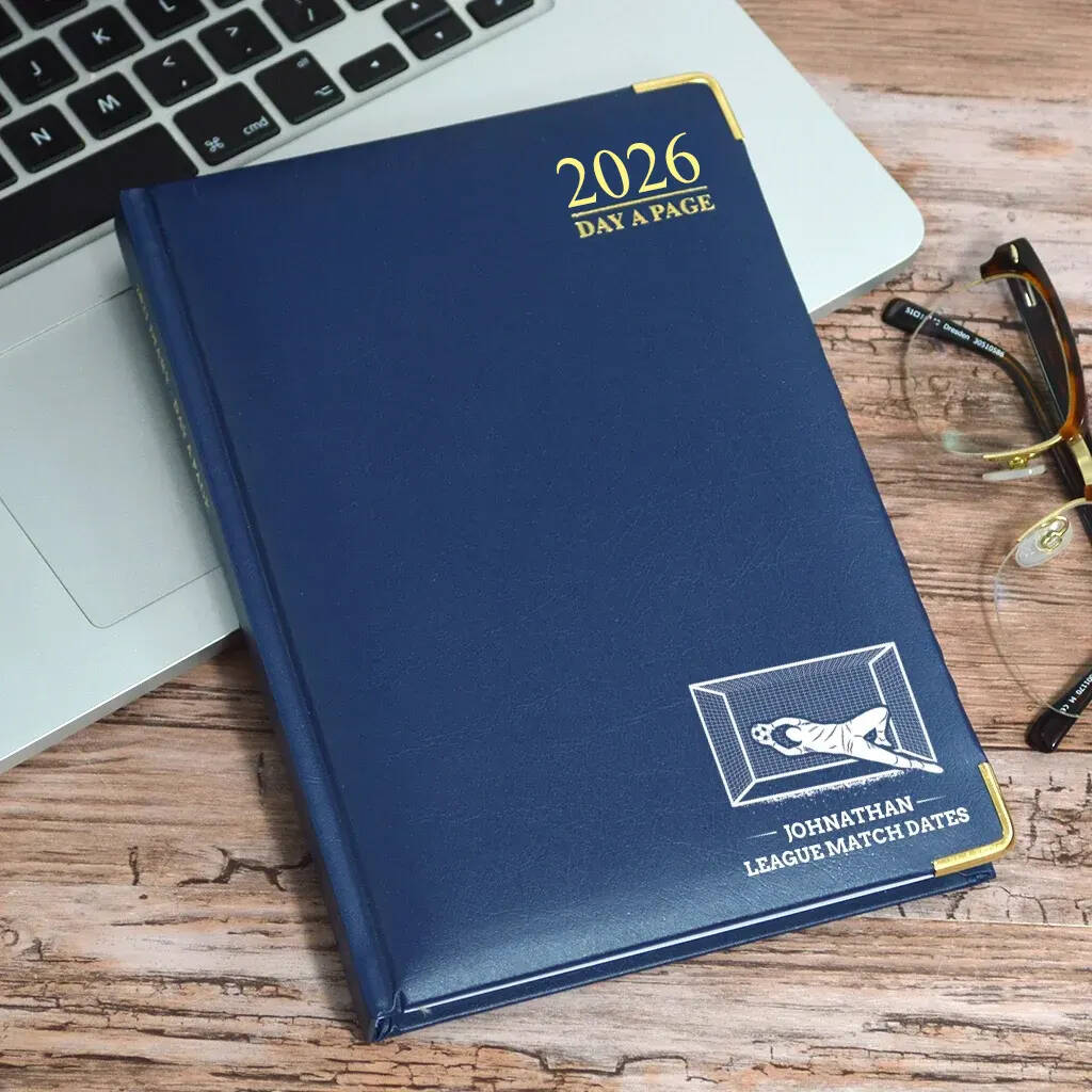 A personalised football diary goalkeeper design, printed with your chosen name and message — a thoughtful 2026 planner for football fans and players alike.