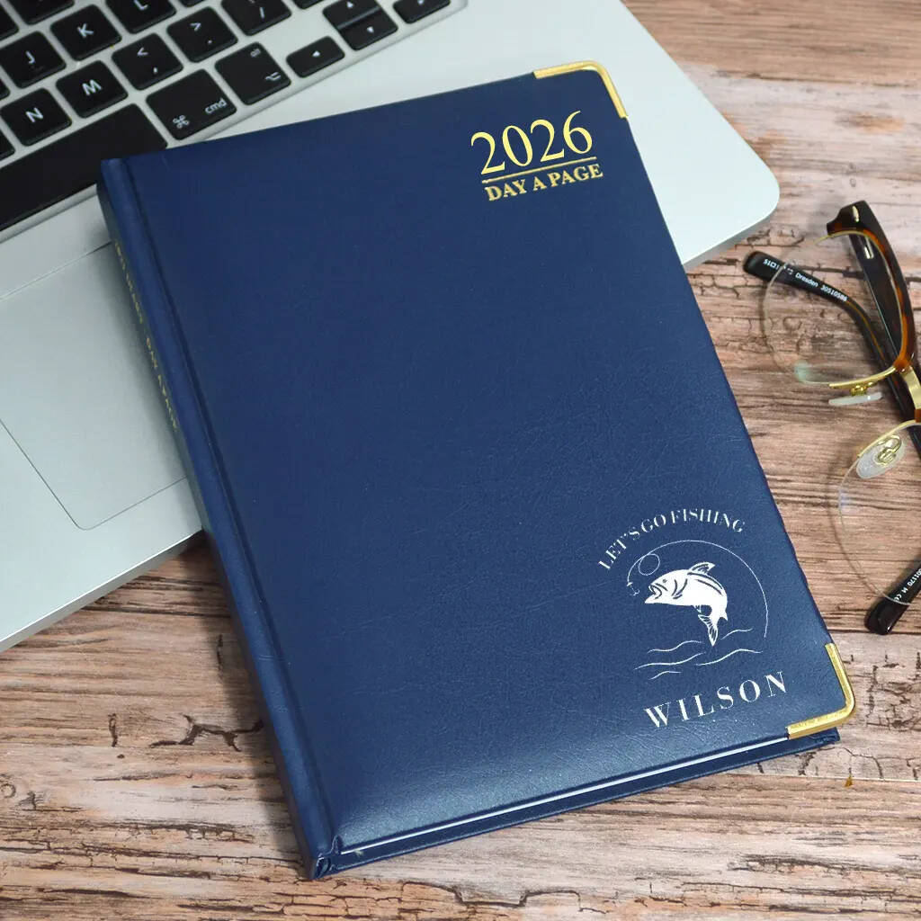 A Personalised diary for 2026 featuring a classic fishing design. Add a name and short message to create the perfect gift for fishing lover.