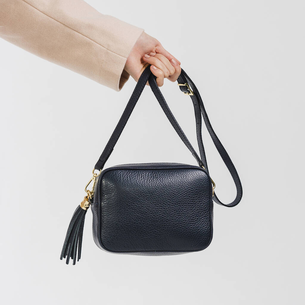 Gorgeous super soft leather zip up crossbody bag with a long over the body strap, closes with the uber cute tassel and can be personalised