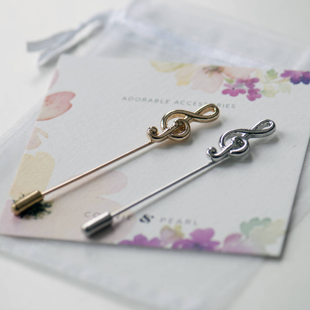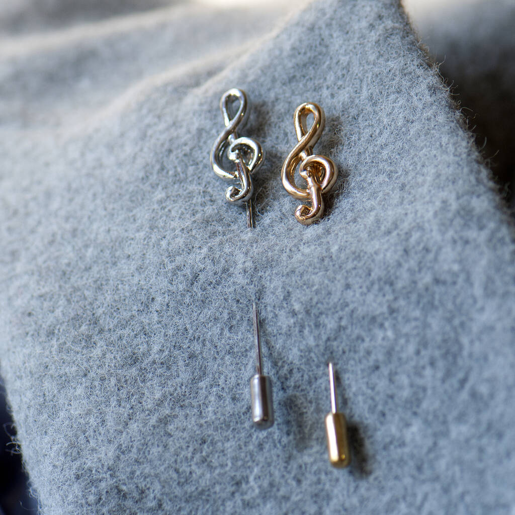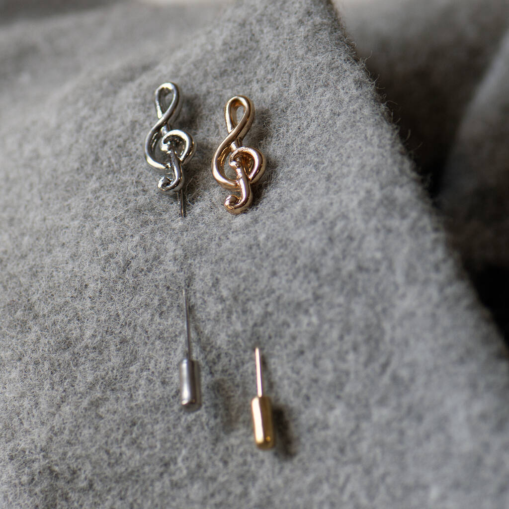 Treble Clef lapel pin available in either silver or gold finish, this unisex pin looks gorgeous on any lapel.