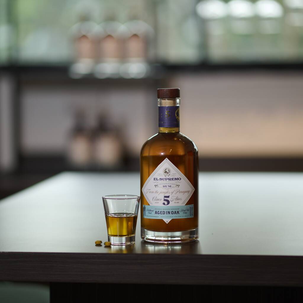 Crafted in Paraguay using over 500 years of rum-making heritage, El Supremo 5 Years Old is a true expression of South American excellence. Made from 100% virgin sugarcane honey and aged in rare Incienso Marrón hardwood barrels before finishing in French oak, this premium rum showcases the authentic character of its origin. No added sugar, colouring, or additives — just pure craftsmanship.
