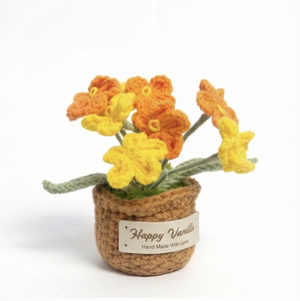 Each flower is meticulously crafted with attention to detail, from the carefully shaped petals to the naturally posed leaves, encapsulated in durable crochet pots.