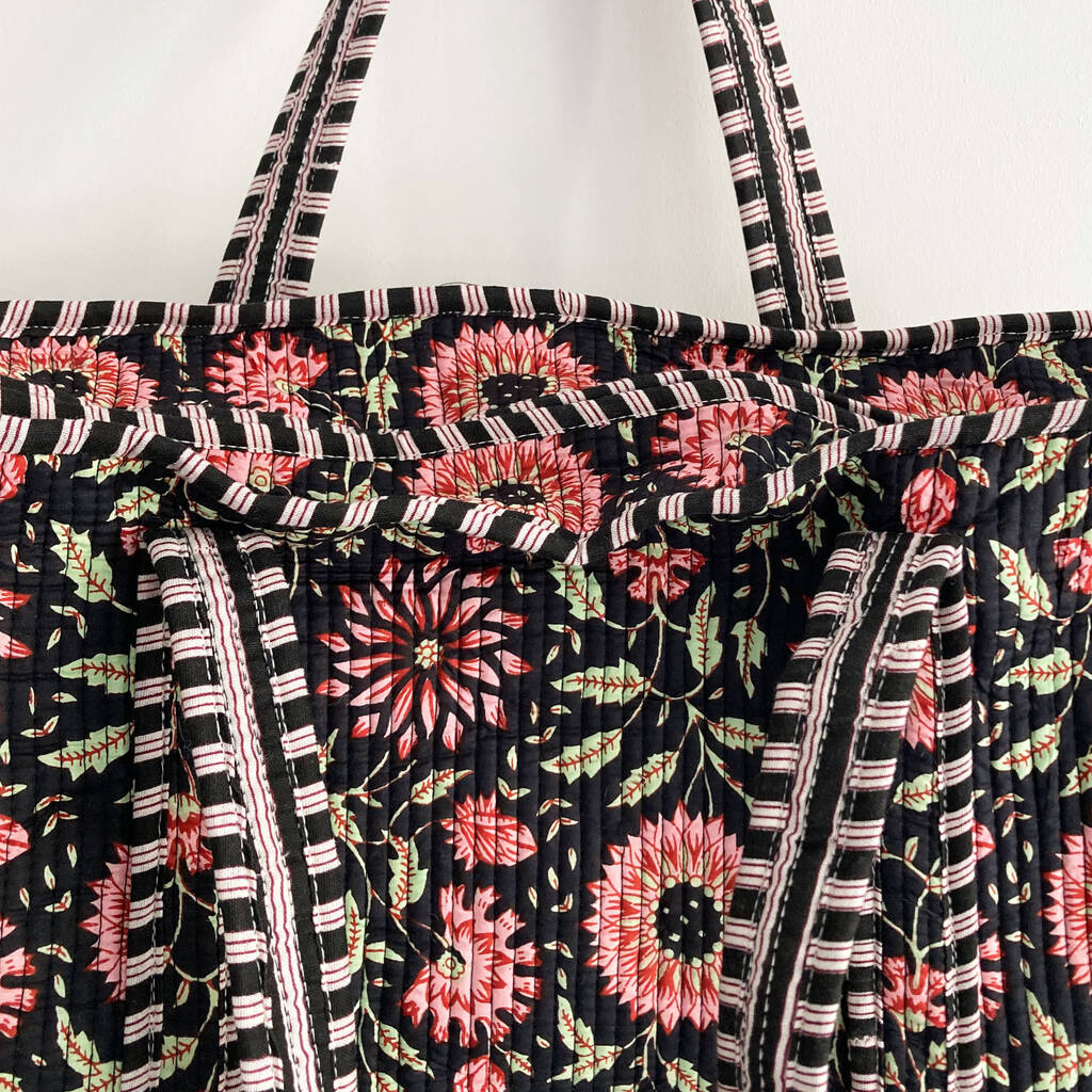 Black And Pink Flower Cotton Quilted Shoulder Bag With Zip
