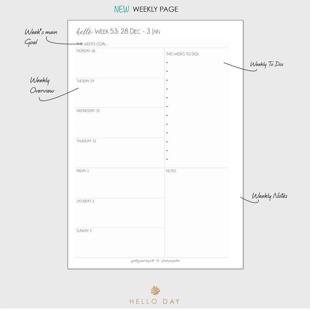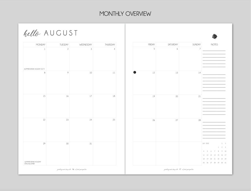 - 12 Double Spreads including Monthly Goal Planning & Monthly Notes, located before each Monthly Calendar
