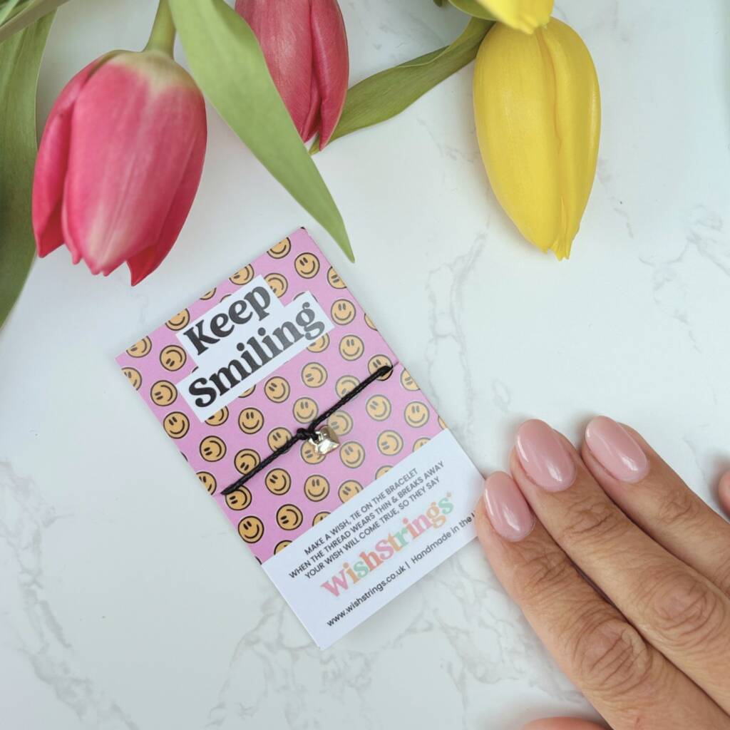 Featuring a silver heart charm on a black waxed cotton cord, this handmade wish bracelet is presented on a cheerful smiley face card with the message: “Keep Smiling!”