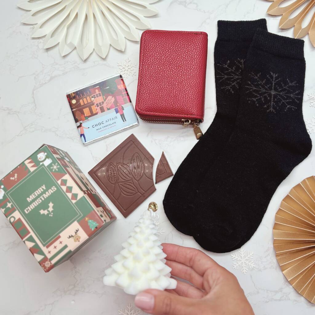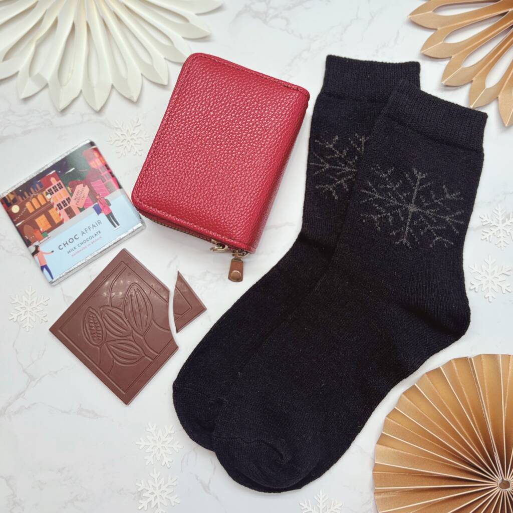A festive red purse and socks Christmas gift with chocolate. Practical, cosy and stylish – a thoughtful present for mums, daughters, sisters or friends.