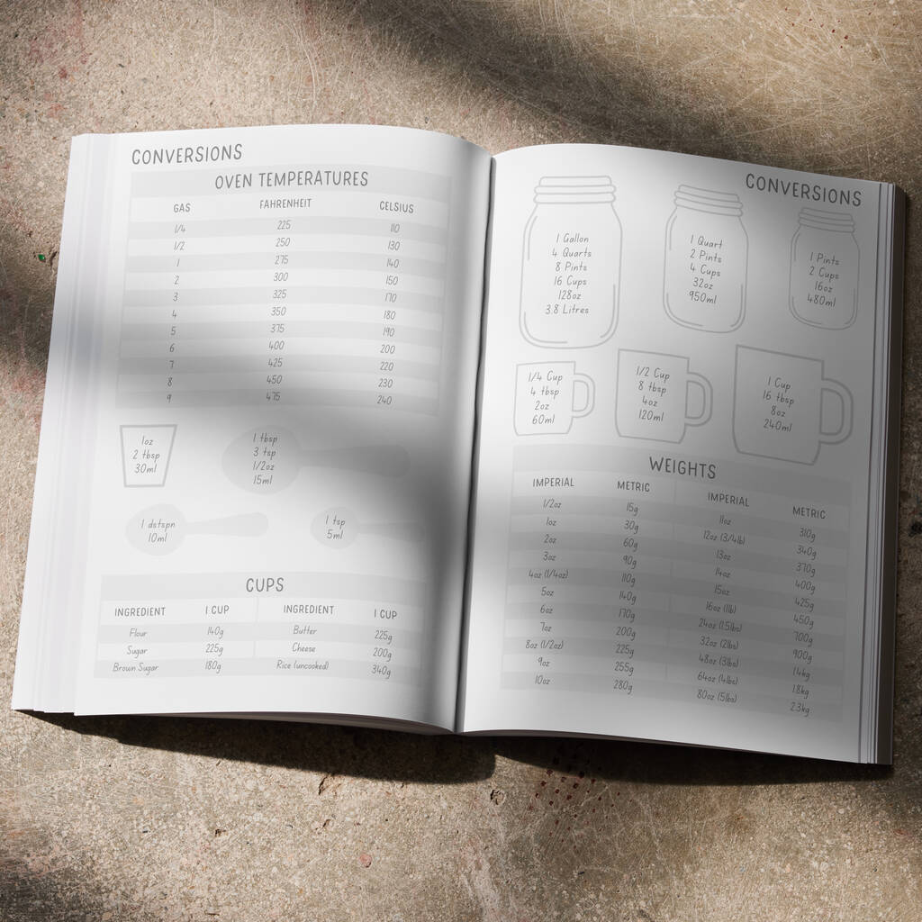 -Conversion Charts to avoid any confusion. These include Oven Temperatures, Cups, Tablespoons, Weights for imperial to metric and more.