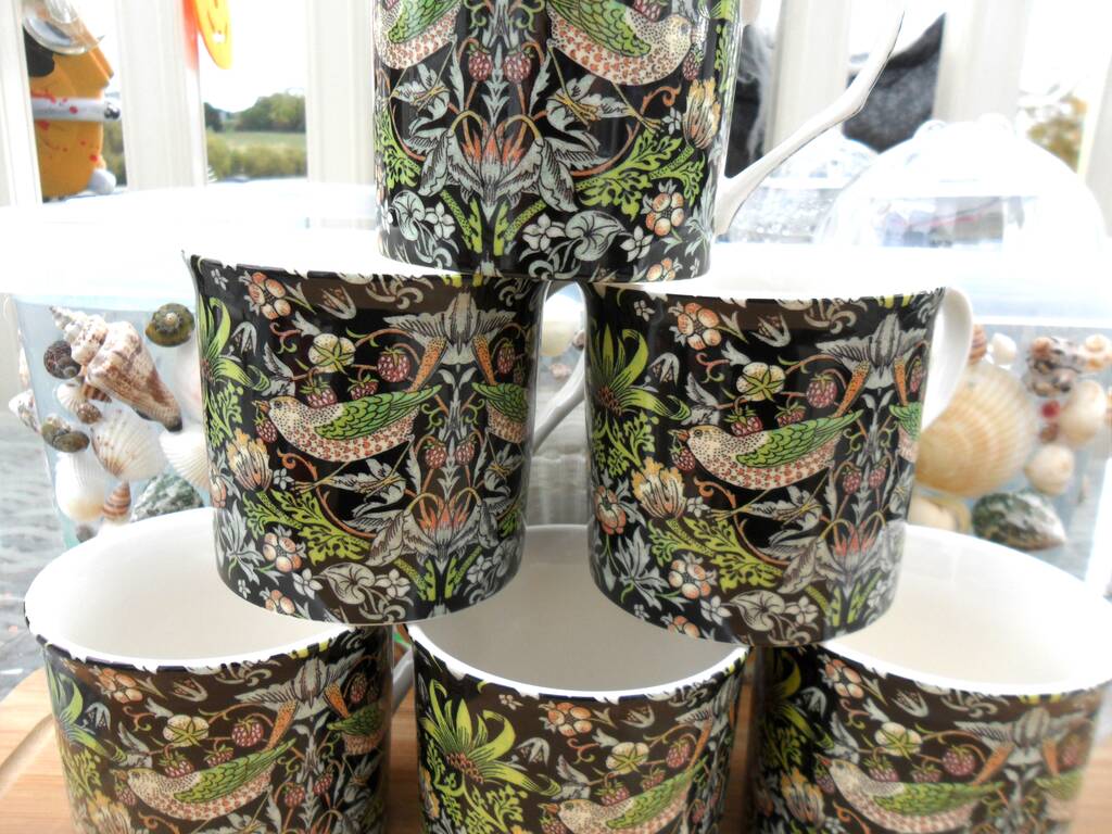 Set Of Six Palace Mugs In William Morris Black Strawberry Thief Design