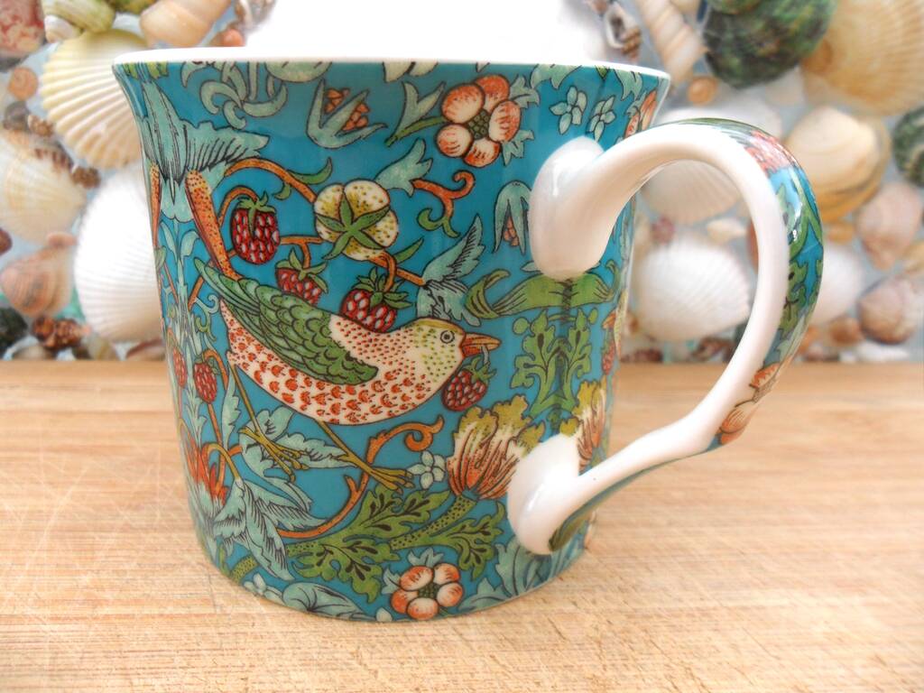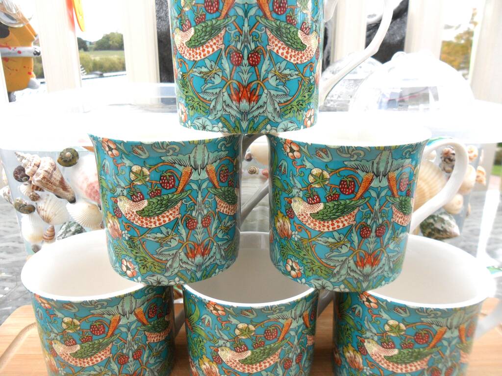 Set Of Six Palace Mugs In William Morris Teal Strawberry Thief Design