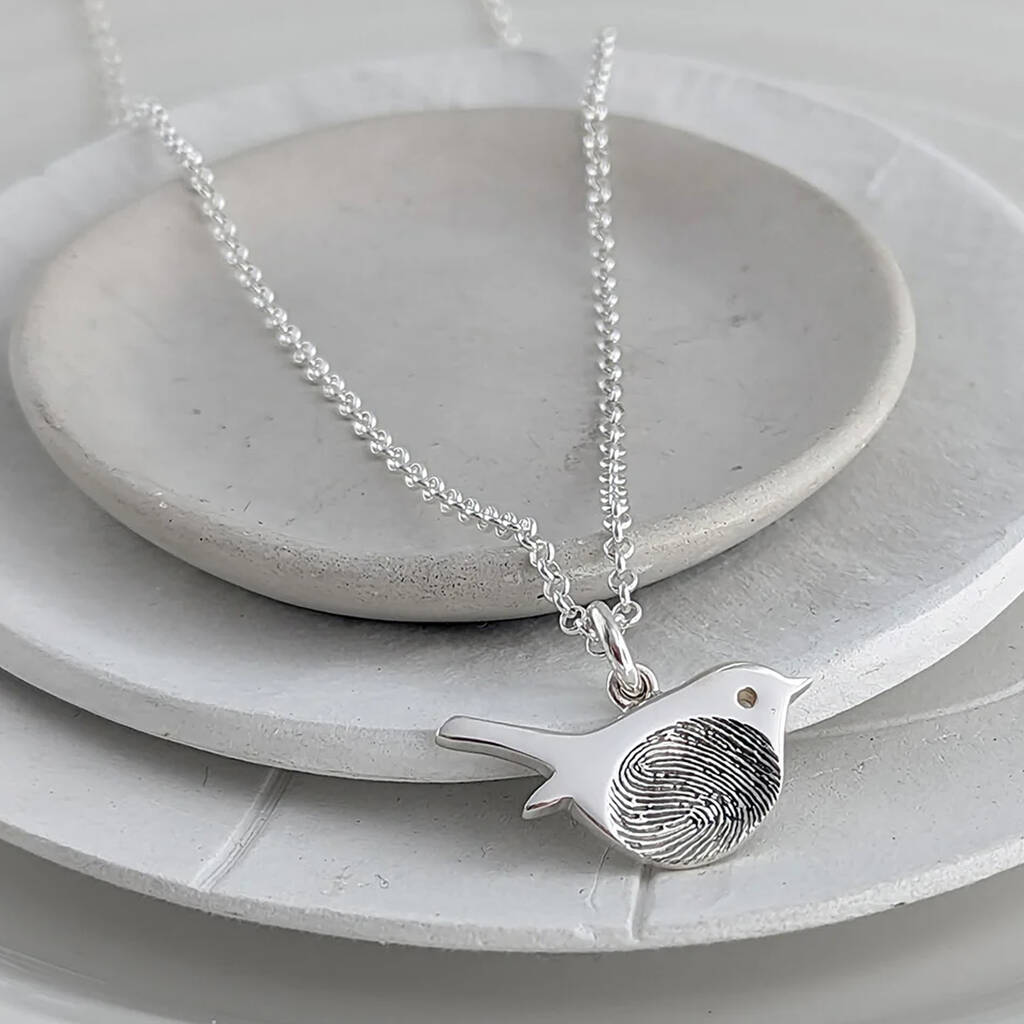 A beautiful robin shaped pendant, made from sterling silver, capturing your loved one's very own unique fingerprint forever.