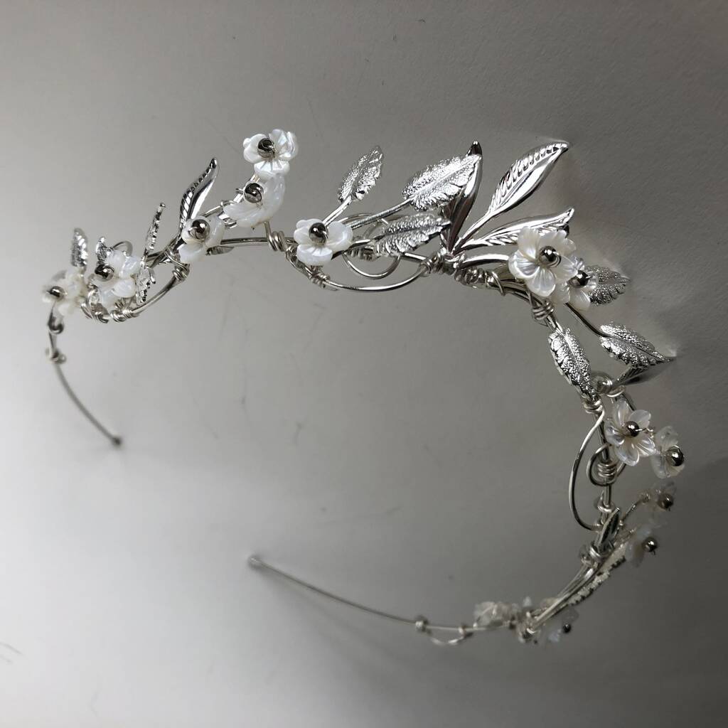 • The Ostara Crown Gold Silver Shell Mother Of Pearl Floral Hair Vine Bridal Headpiece, thumbnail 12 of 12