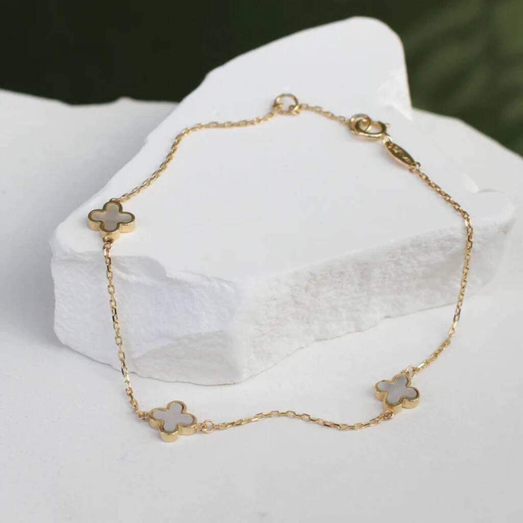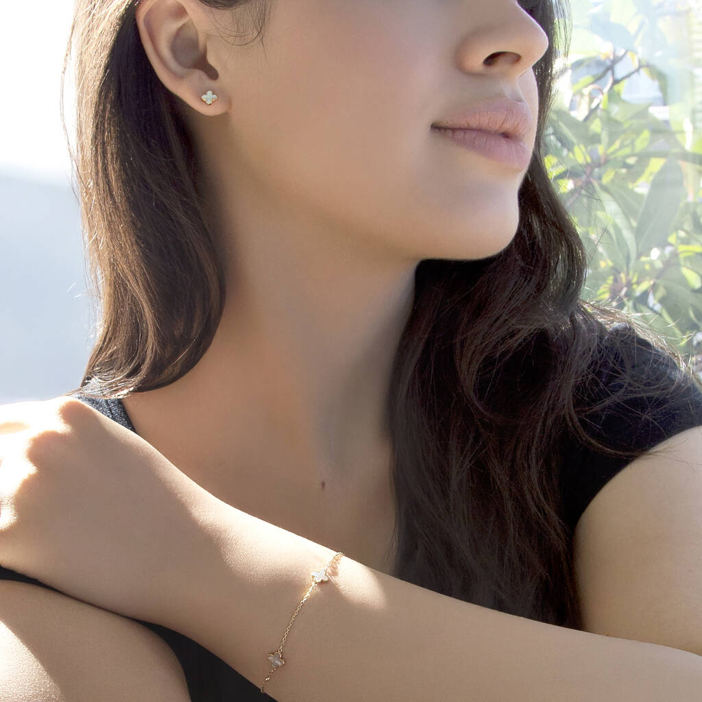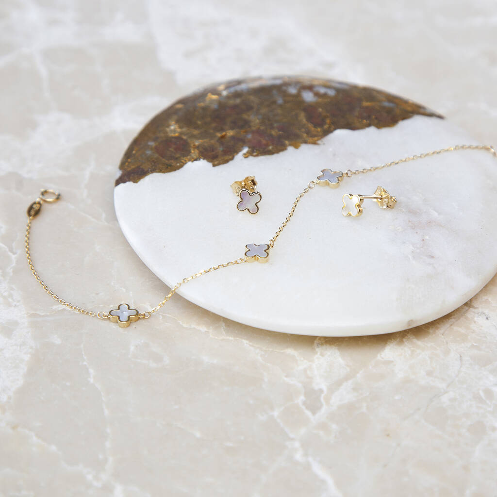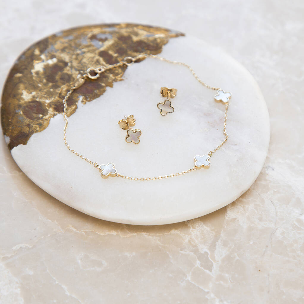 9ct Gold Mother Of Pearl Clover Bracelet And Earrings Set