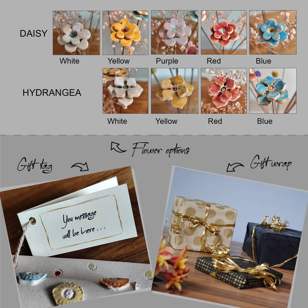Choice of 5 colours and 2 types of flowers. Daisy or Hydrangea.