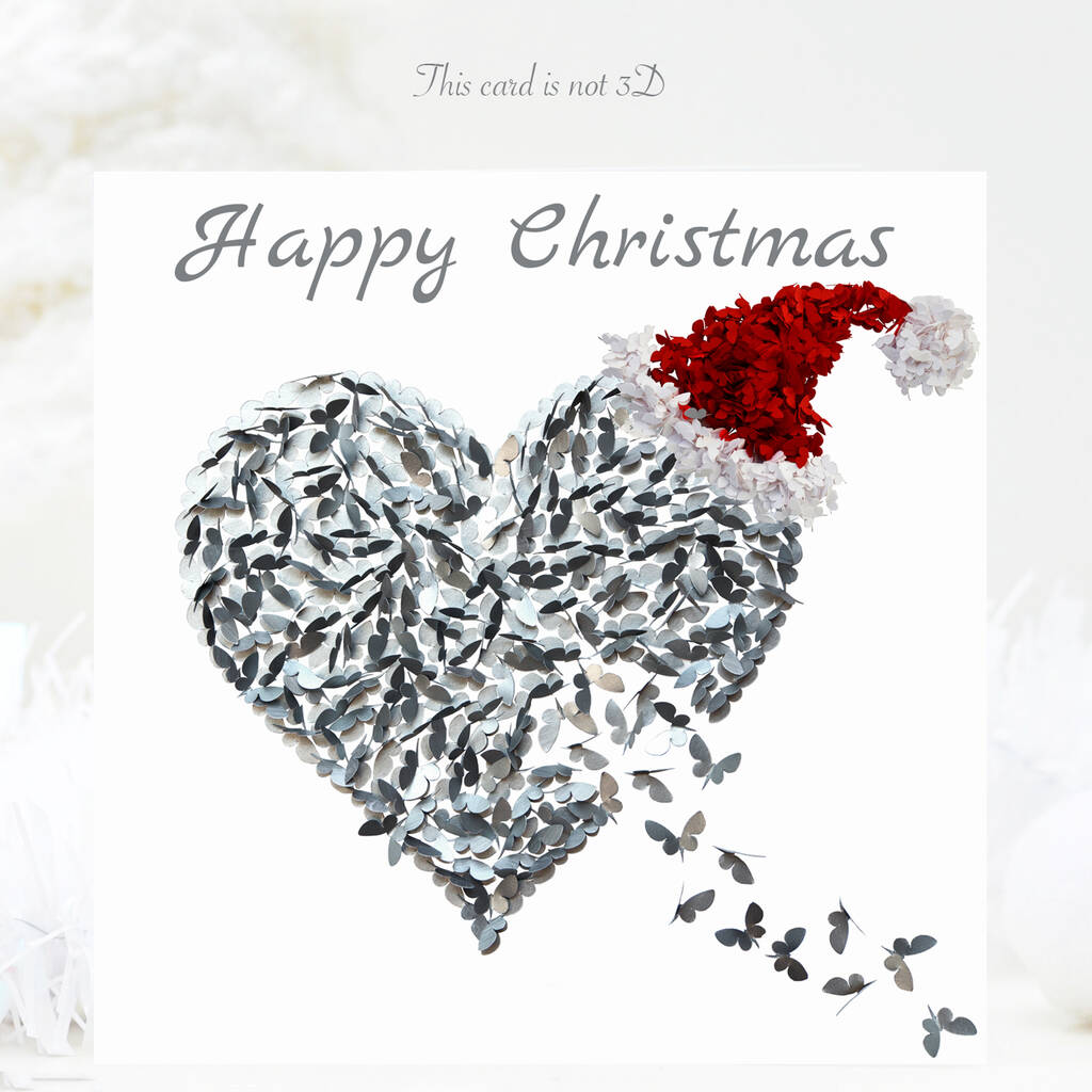 Five Silver Heart Santa's Hat butterfly cards. Santa's hat is perched on the silver butterfly heart. Digitally printed, not 3D