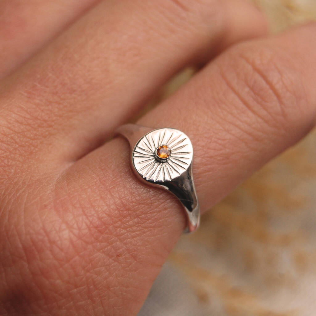 Sunburst Birthstone Signet Boho Ring In Silver Or Gold, 1 of 9